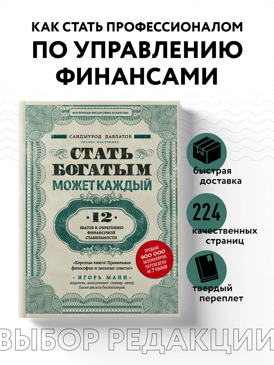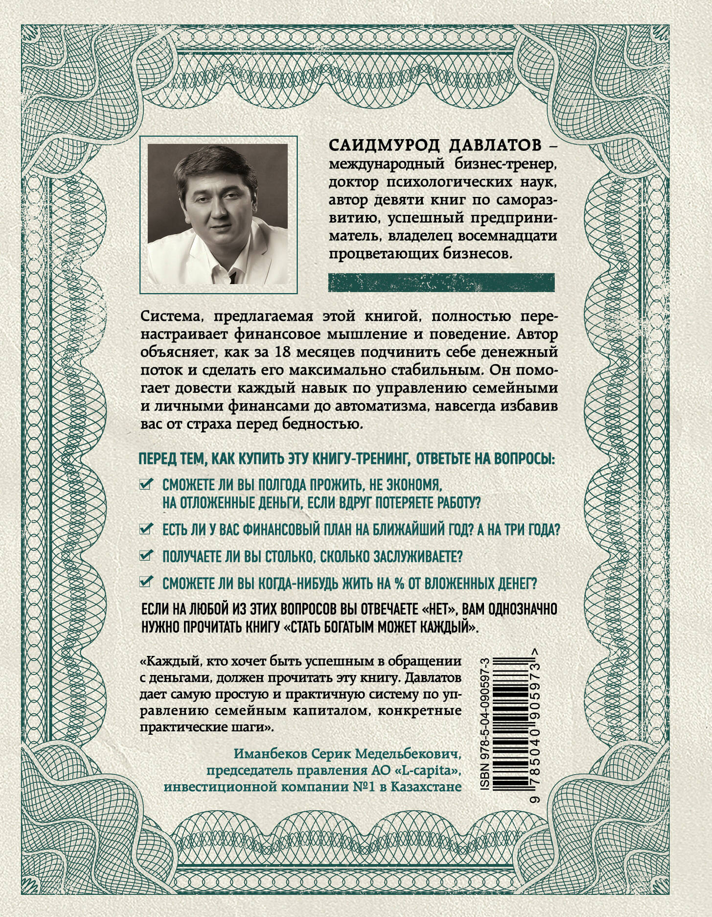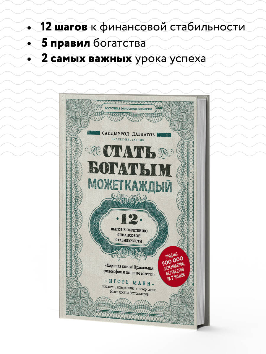 4 причины, почему нужно читать эту книгу и внедрять в своей жизни изложенную в ней систему: 1. Если все оставить, как есть, вы навсегда будете рабом собственных расходов. Только подумайте: человек зарабатывает деньги 8 часов в сутки, а тратит - 24. Речь о коммунальных услугах, налогах, аренде жилья и т.д. Поэтому одна из главных задач этой книги - сделать так, чтобы деньги работали на вас круглые сутки, день и ночь. 2. Расходы стабильны, доходы - увы, нет. В любой момент вы можете заболеть, попасть под сокращение, оказаться уволенным по самым разным причинам. При этом необходимость каждый день есть, кормить детей, пользоваться жильем, водопроводом, газом и отоплением никуда не денется. Еще одна цель книги «Стать богатым может каждый» - объяснить, как обеспечить финансовую безопасность своей семье вне зависимости от любых обстоятельств. 3. Жизнь дорожает с каждым днем. Вспомните, что можно было купить на 1000 рублей десять лет назад. А что сейчас? В лучшем случае десятую часть. При этом наши доходы не поспевают за инфляцией. Что делать? Пользоваться принципами инвестирования, изложенными в книге, добиваясь собственной независимости от экономических неурядиц. 4. Искушение кредитами - проблема современного общества. Не понимая, как обращаться с деньгами, мы влезаем в огромные долги. В книге «Стать богатым может каждый» прописаны основные принципы, которые помогут вам не совершать роковых ошибок. Главное, что необходимо сделать, это превратить деньги в послушного и ответственного работника. Хватит работать НА них. Пора подобно всем состоятельным людям заставить деньги работать НА СЕБЯ. Поверьте, им это по силам. Устройте деньги на работу и обретите желанную финансовую свободу.| Издательство | ООО "Издательство "Эксмо" |