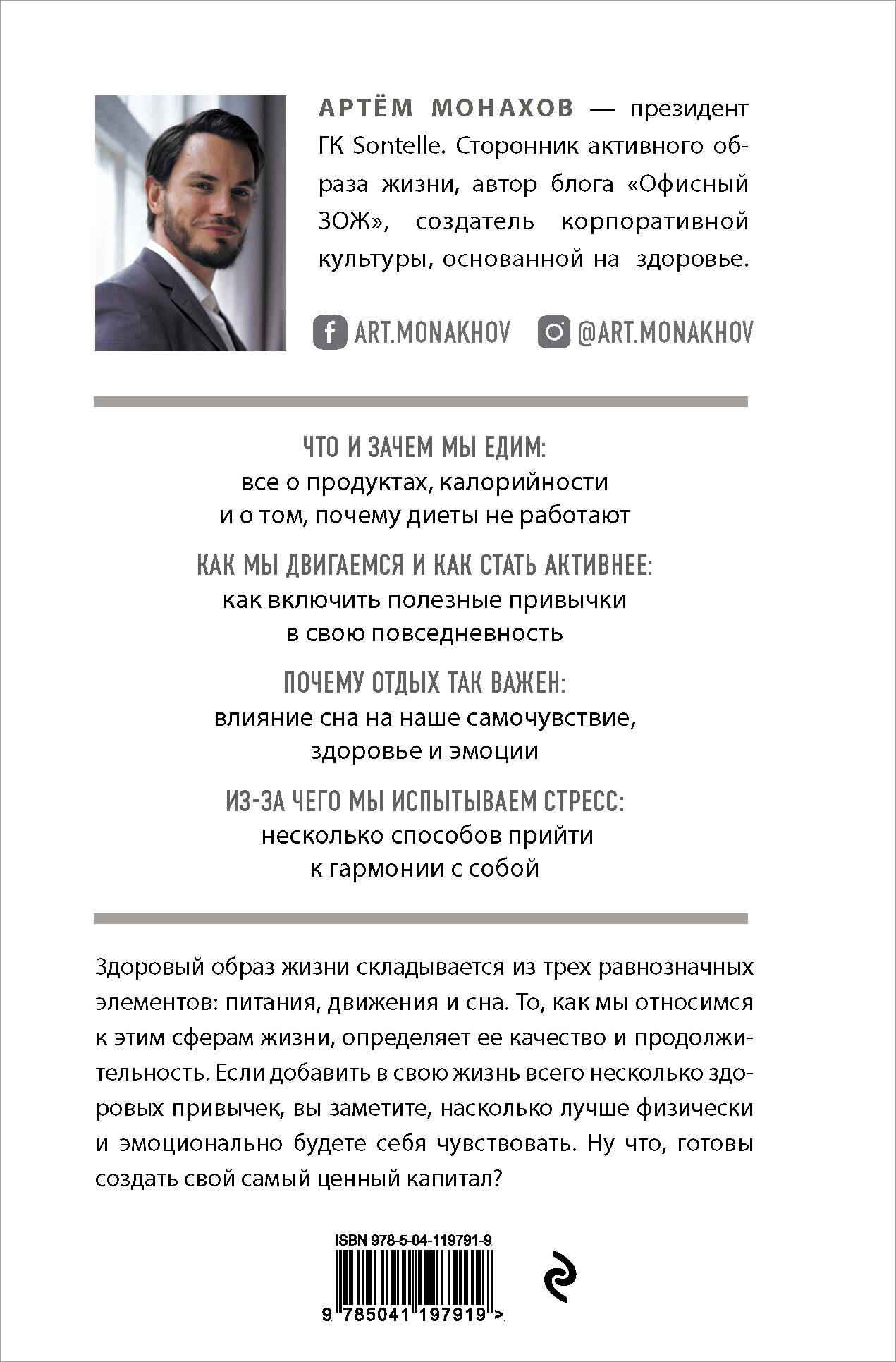 Эта книга - подробный и основательный обзор здоровых привычек, без которых невозможно представить себе продолжительной и полноценной жизни. В ней разбираются психология питания и главные принципы, питьевой режим и влияние воды на состояние организма, работа гормонов и оптимальные виды физической активности. По каким симптомам можно выявить стресс? Существуют ли гормоны счастья, творчества и красоты? Какие ошибки мы чаще всего совершаем в своем питании и от каких привычек стоит избавиться? Что лучше - бег или ходьба? Капитал здоровых привычек - это самый ценный вклад, который можно себе представить!| Издательство | ООО "Издательство "Эксмо" |