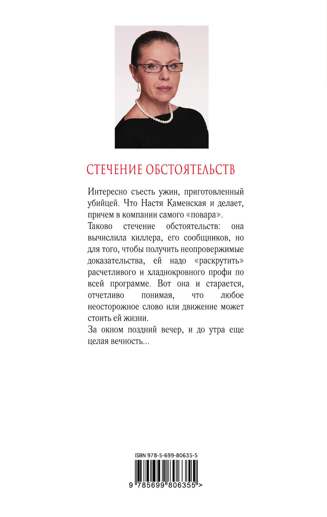 Интересно съесть ужин, приготовленный убийцей. Что Настя Каменская и делает, причем в компании самого «повара». Таково стечение обстоятельств: она вычислила киллера, его сообщников, но для того, чтобы получить неопровержимые доказательства, ей надо «раскрутить» расчетливого и хладнокровного профи по всей программе. Вот она и старается, отчетливо понимая, что любое неосторожное слово или движение может стоить ей жизни. За окном поздний вечер, и до утра еще целая вечность... «Маринина не только пишет детективные романы, но и отвечает на вечные вопросы. Автор относится к своим читателям как добрый и опытный учитель к ученикам, которые нуждаются в поддержке, подсказке и направлении на верный путь. Оптимистичная и практичная в своей дидактике, Маринина ставит перед собой вопрос "как жить" и старается помочь читателю найти свой путь к лучшей жизни в сегодняшнем мире. Своими детективами Маринина пишет современный роман "воспитания чувств": основная цель автора - воспитание посредством развлечения». - Анатолий Вишевский, Гринелльский колледж, США «Многие романы Александры Марининой в России экранизированы, а в Германии переработаны в радиопьесы. Исходя из того, что цель этих обработок - захватывать зрителей и слушателей таким же образом, как захвачены читатели, то фильм и радиопьеса являются не только дополнительными художественными произведениями, но и интересными интерпретациями, которые проникли в тайну успеха Александры Марининой». - Сара Хэги, Кельнский университет, Германия «В диалогах художественной и тривиальной литературы можно обнаружить разные способы стилизации "устности", чтобы достичь впечатления спонтанного разговора. Обиходная речь в романах А. Марининой отличается необыкновенно высокой степенью оживленности, что выражается, между прочим, в разных формах обращения собеседников, в различных оттенках вежливости и в эмоциональности используемой лексики». - Вольфганг Штадлер, Университет имени Леопольда Францена, Инсбрук, Австрия| Издательство | ООО "Издательство "Эксмо" |