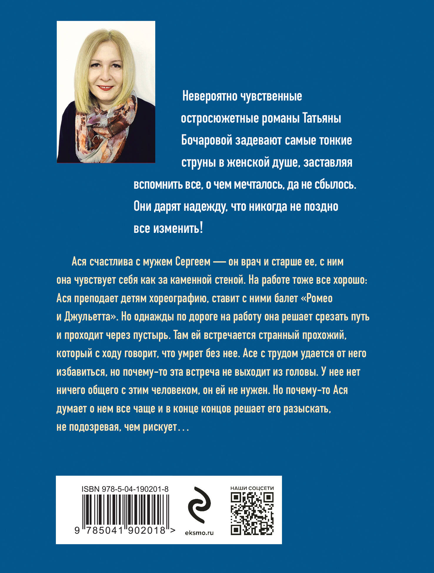 Ася счастлива с мужем Сергеем - он врач и старше ее, с ним она чувствует себя как за каменной стеной. На работе тоже все хорошо: Ася преподает детям хореографию, ставит с ними балет «Ромео и Джульетта». Но однажды по дороге на работу она решает срезать путь и проходит через пустырь. Там ей встречается странный прохожий, который с ходу говорит, что умрет без нее. Асе с трудом удается от него избавиться, но почему-то эта встреча не выходит из головы. У нее нет ничего общего с этим человеком, он ей не нужен. Но почему-то Ася думает о нем все чаще и в конце концов решает его разыскать, не подозревая, чем рискует… В своих романах Татьяна Бочарова синтезирует разные жанры: это и детектив, и мелодрама, и обязательно лирическая история о человеческих чувствах и переживаниях. Ее герои - простые люди, наши с вами современники, которые волею судьбы оказались в сложной ситуации. Им предстоит сделать непростой выбор, разобраться в дебрях козней и обмана, не сломаться, выстоять, помочь не только себе, но и тем, кому необходима их помощь.| Издательство | ООО "Издательство "Эксмо" |