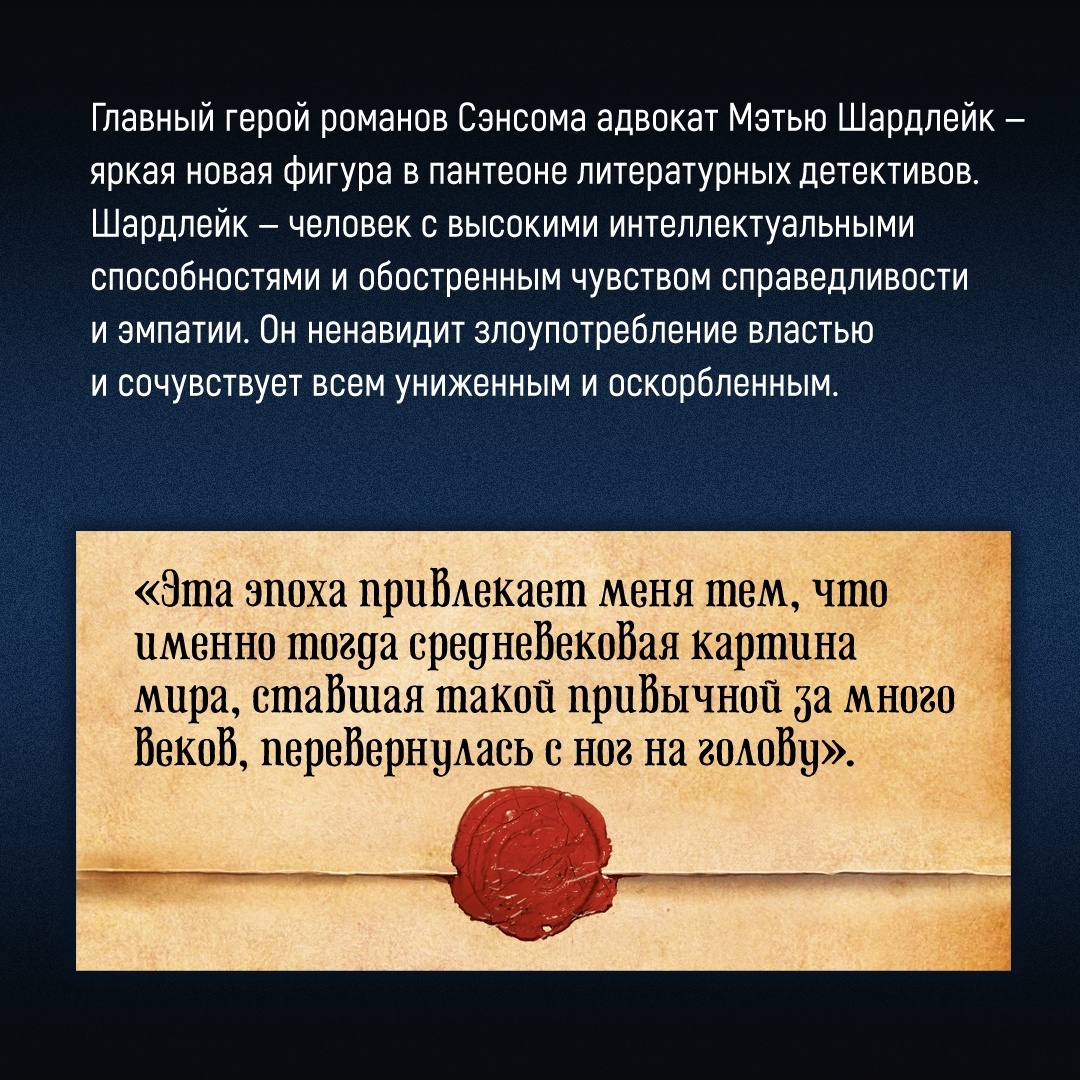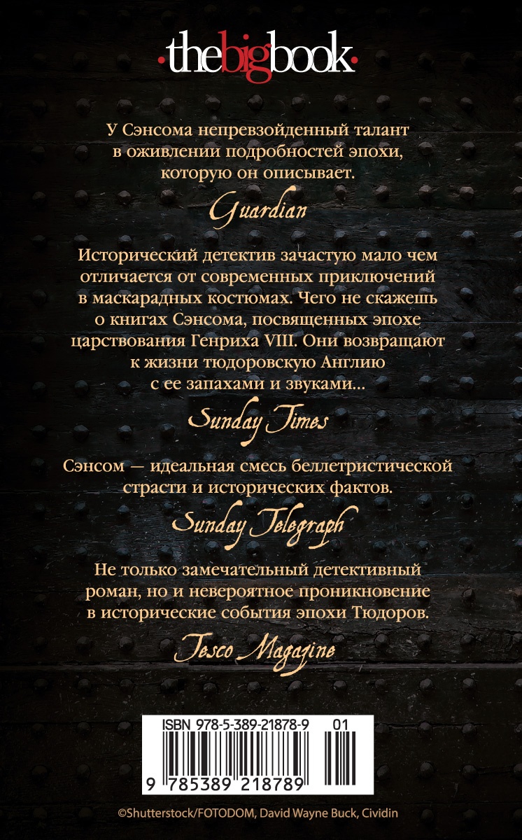 Англия, 1546 год. Последний год жизни короля Генриха VIII. Самый сложный за все время его правления. Еретический бунт, грубые нападки на королеву, коренные изменения во внешней политике, вынужденная попытка примирения с папой римским, а под конец - удар ниже пояса: переход Тайного совета под контроль реформаторов… На этом тревожном фоне сыщик-адвокат Мэтью Шардлейк расследует странное преступление, случившееся в покоях Екатерины Парр, супруги Генриха, - похищение драгоценного перстня. На самом деле, Шардлейк в этом скоро убеждается, перстень - это обманка. Похищена рукопись королевы под названием «Стенание грешницы», и ее публикация может стоить Екатерине жизни… В мире литературных героев и в сознании сегодняшнего читателя образ Мэтью Шардлейка занимает почетное место в ряду с такими известными персонажами, как Шерлок Холмс, Эркюль Пуаро, Ниро Вулф и комиссар Мегрэ.| Издательство | Азбука |