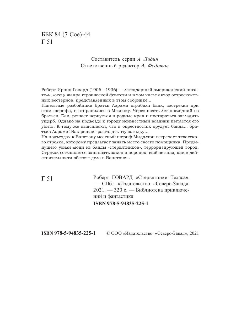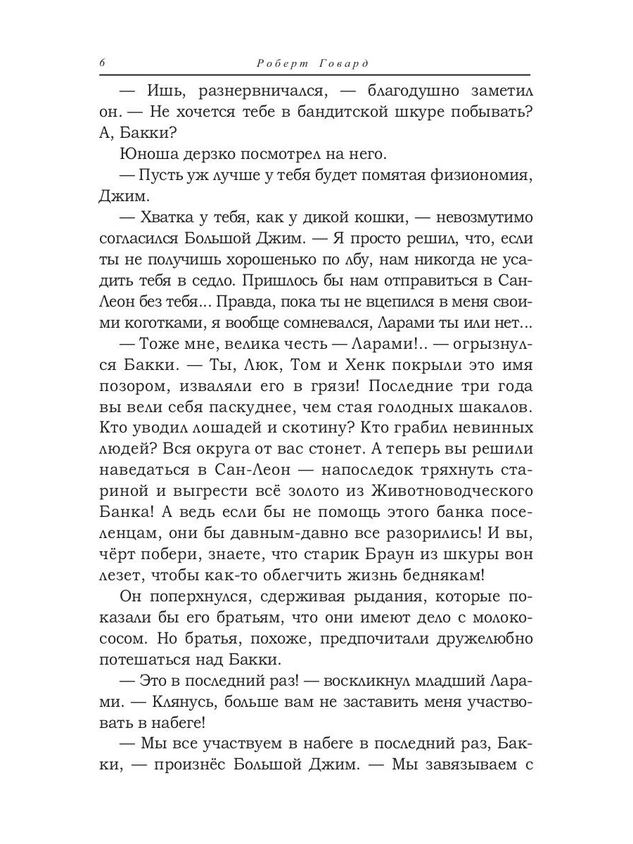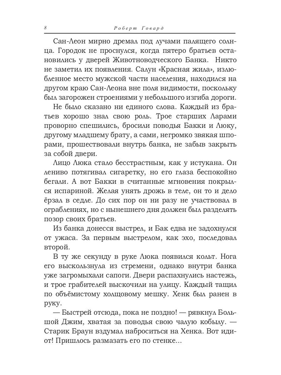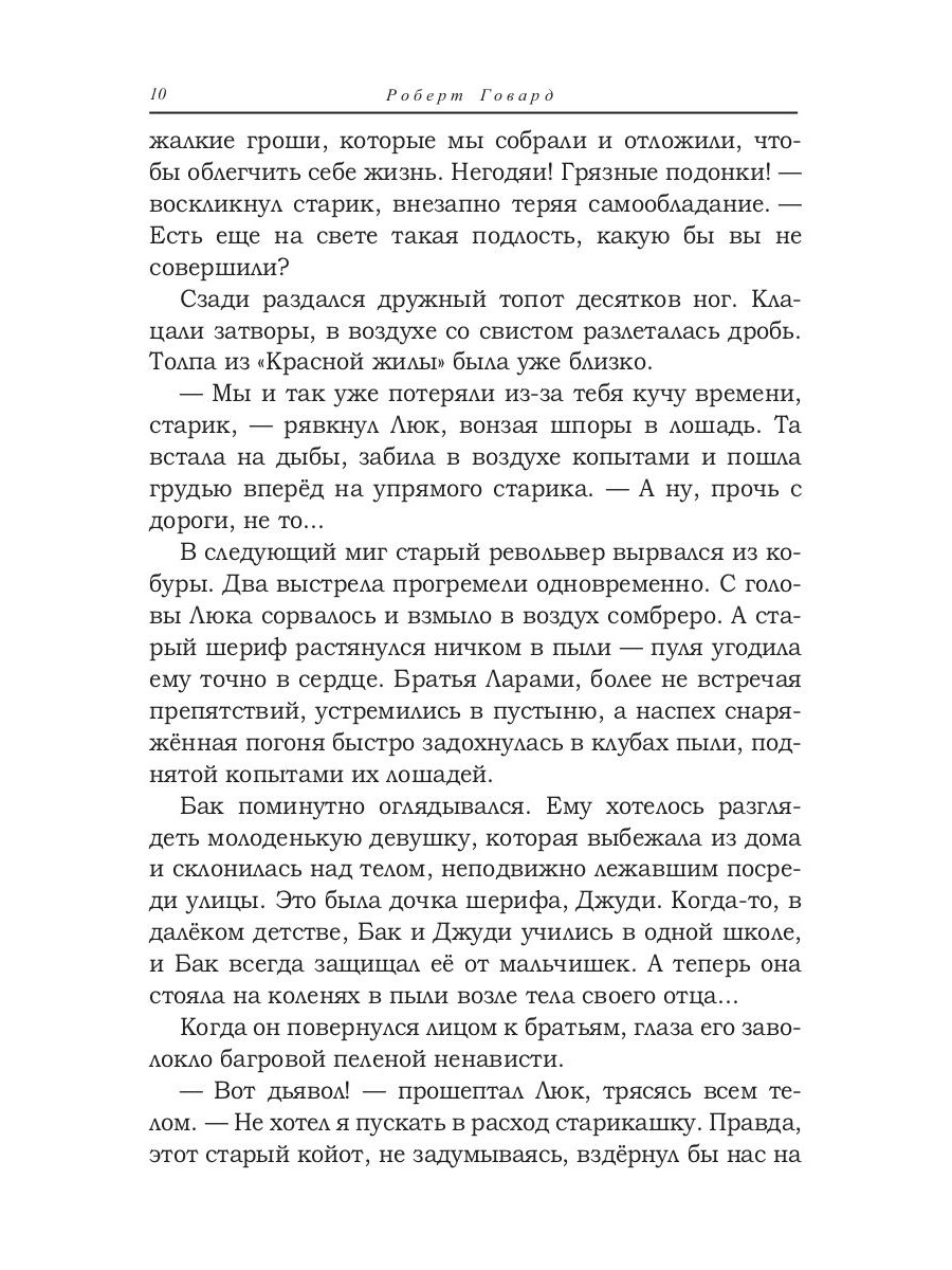 Роберт Ирвин Говард (1906-1936) - легендарный американский писатель, «отец» жанра героической фэнтези и в том числе автор остросюжетных вестернов, представленных в этом сборнике... Известные разбойники братья Ларами ограбили банк, застрелив при этом шерифа, и отправились в Мексику. Через шесть лет последний из братьев, Бак, решает вернуться в родные края и постараться загладить ущерб. Однако на подъезде к городу неизвестный всадник пытается его убить. К тому же выясняется, что в окрестностях орудует банда... братьев Ларами! Бак решает разгадать эту загадку... На подъездах к Вапетону местный шериф Миддлтон встречает техасского стрелка, которому предлагает занять место своего помощника. Предыдущего убили люди из банды «стервятников», терроризирующей город. Стрелок соглашается защищать закон и порядок, ещё не зная, как в действительности обстоят дела в Вапетоне...| Издательство | Т8 RUGRAM |
