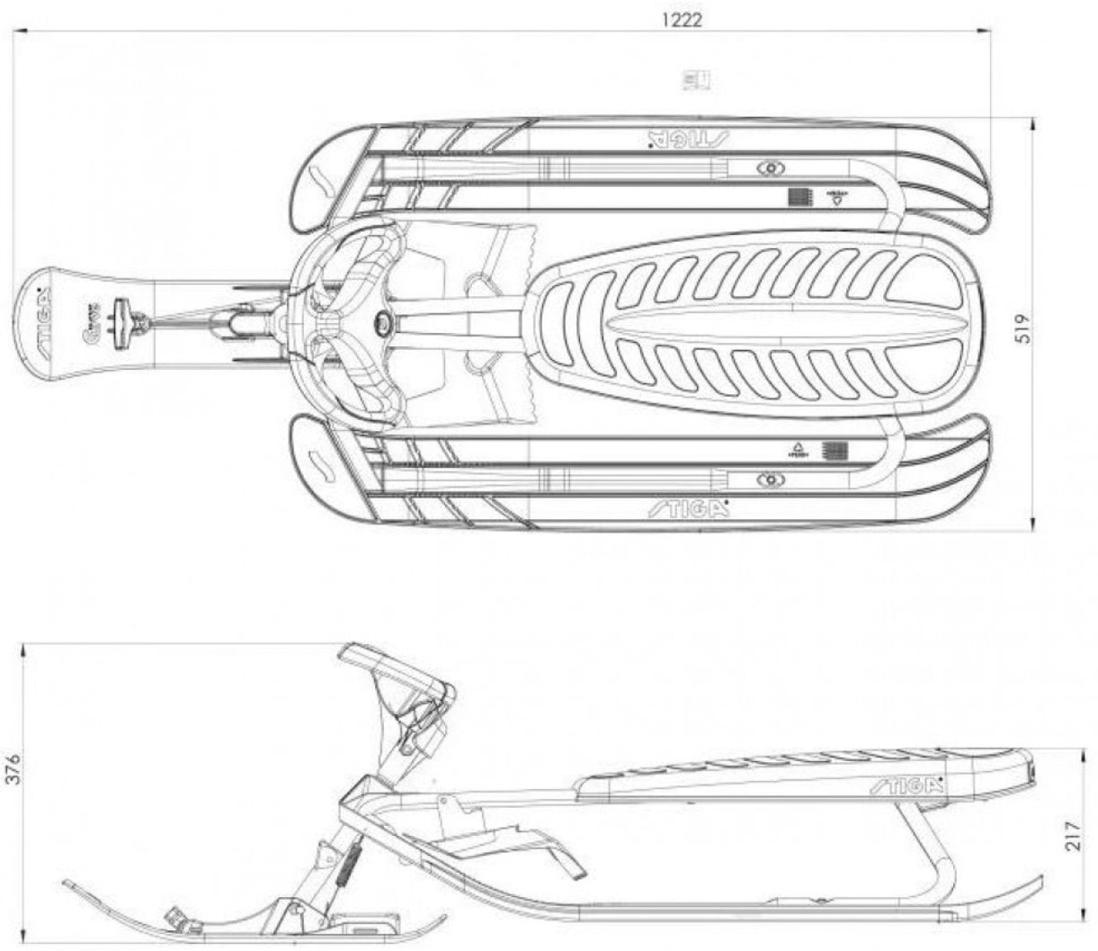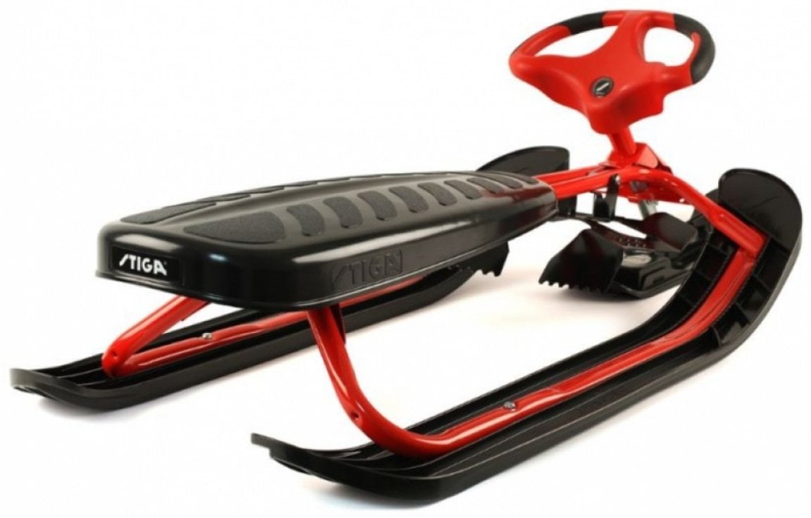 Прочная стальная рама и тормоза, руль и система Stiga Curve Ski System - для устойчивости и долговечности.