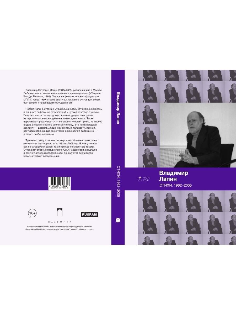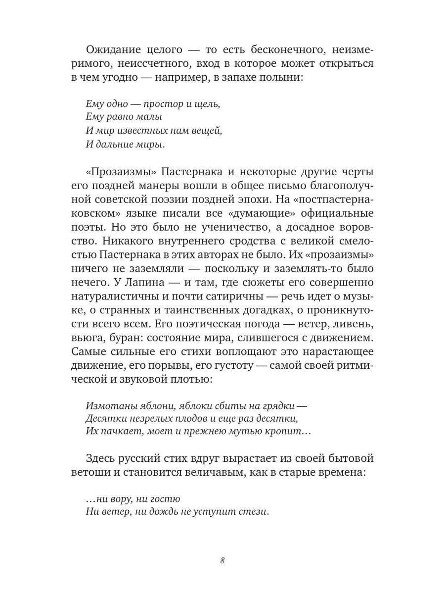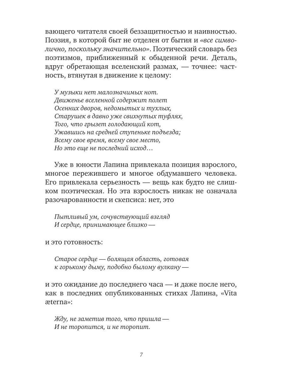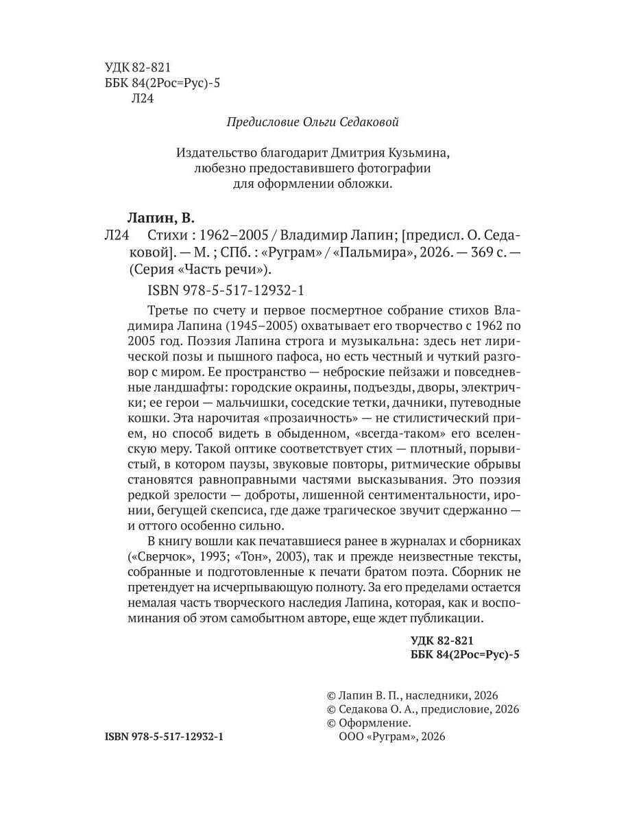 Третье по счету и первое посмертное собрание стихов Владимира Лапина (1945-2005) охватывает его творчество с 1962 по 2005 год. Поэзия Лапина строга и музыкальна: здесь нет лирической позы и пышного пафоса, но есть честный и чуткий разговор с миром. Ее пространство - неброские пейзажи и повседневные ландшафты: городские окраины, подъезды, дворы, электрички; ее герои - мальчишки, соседские тетки, дачники, путеводные кошки. Эта нарочитая "прозаичность" - не стилистический прием, но способ видеть в обыденном, "всегда-таком" его вселенскую меру. Такой оптике соответствует стих - плотный, порывистый, в котором паузы, звуковые повторы, ритмические обрывы становятся равноправными частями высказывания. Это поэзия редкой зрелости - доброты, лишенной сентиментальности, иронии, бегущей скепсиса, где даже трагическое звучит сдержанно - и оттого особенно сильно. В книгу вошли как печатавшиеся ранее в журналах и сборниках ("Сверчок", 1993; "Тон", 2003), так и прежде неизвестные тексты, собранные и подготовленные к печати братом поэта. Сборник не претендует на исчерпывающую полноту. За его пределами остается немалая часть творческого наследия Лапина, которая, как и воспоминания об этом самобытном авторе, еще ждет публикации.| Издательство | Т8 RUGRAM |