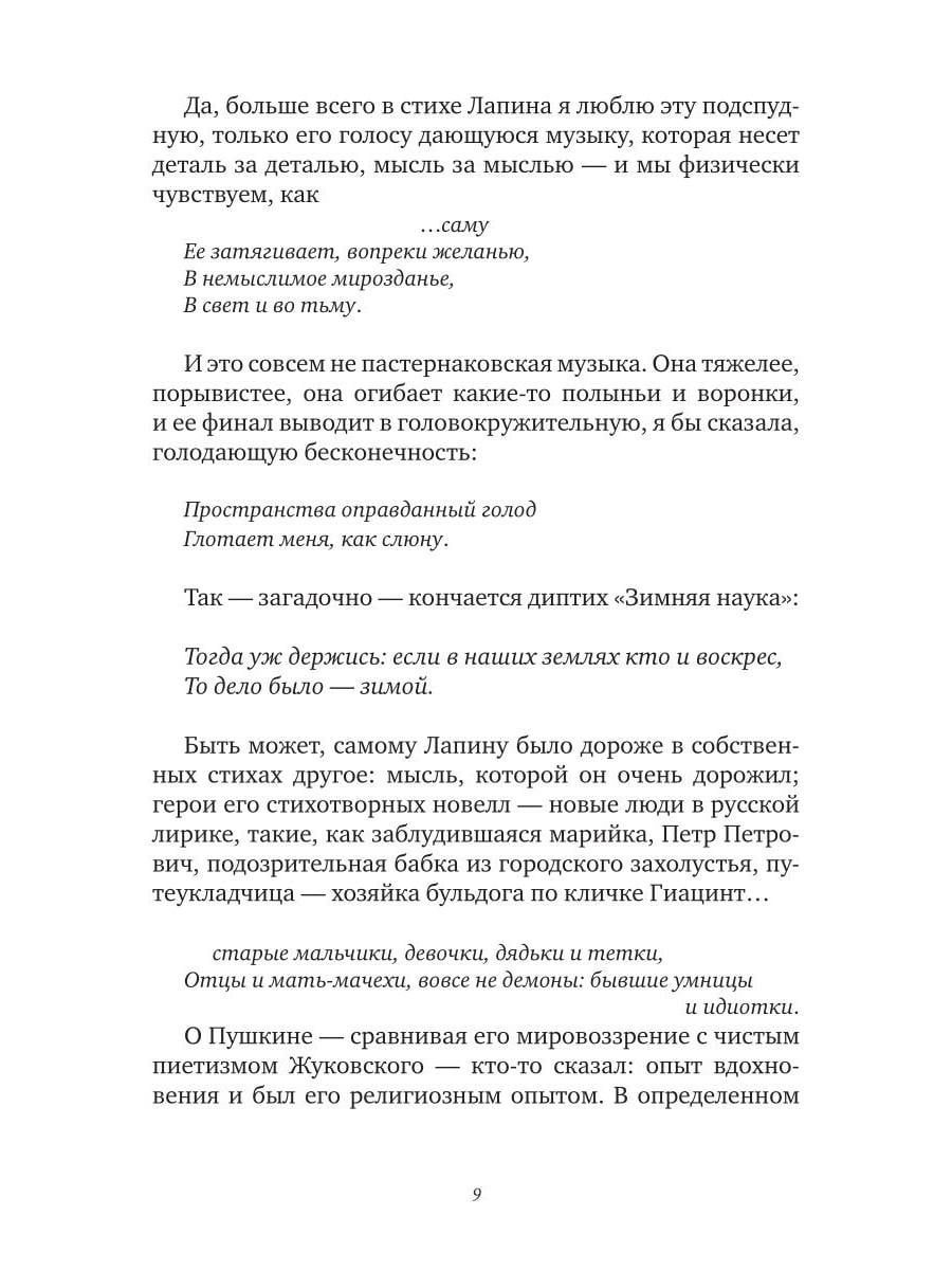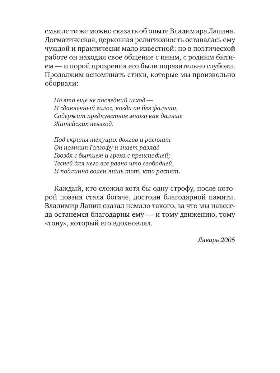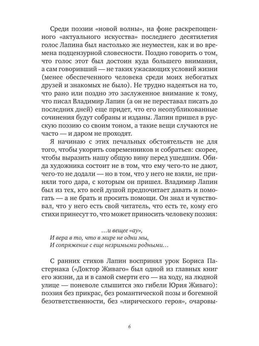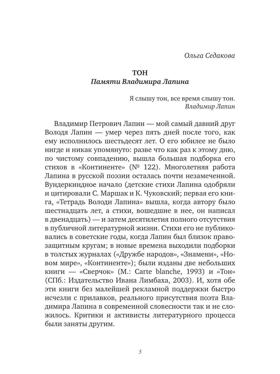 Третье по счету и первое посмертное собрание стихов Владимира Лапина (1945-2005) охватывает его творчество с 1962 по 2005 год. Поэзия Лапина строга и музыкальна: здесь нет лирической позы и пышного пафоса, но есть честный и чуткий разговор с миром. Ее пространство - неброские пейзажи и повседневные ландшафты: городские окраины, подъезды, дворы, электрички; ее герои - мальчишки, соседские тетки, дачники, путеводные кошки. Эта нарочитая "прозаичность" - не стилистический прием, но способ видеть в обыденном, "всегда-таком" его вселенскую меру. Такой оптике соответствует стих - плотный, порывистый, в котором паузы, звуковые повторы, ритмические обрывы становятся равноправными частями высказывания. Это поэзия редкой зрелости - доброты, лишенной сентиментальности, иронии, бегущей скепсиса, где даже трагическое звучит сдержанно - и оттого особенно сильно. В книгу вошли как печатавшиеся ранее в журналах и сборниках ("Сверчок", 1993; "Тон", 2003), так и прежде неизвестные тексты, собранные и подготовленные к печати братом поэта. Сборник не претендует на исчерпывающую полноту. За его пределами остается немалая часть творческого наследия Лапина, которая, как и воспоминания об этом самобытном авторе, еще ждет публикации.| Издательство | Т8 RUGRAM |