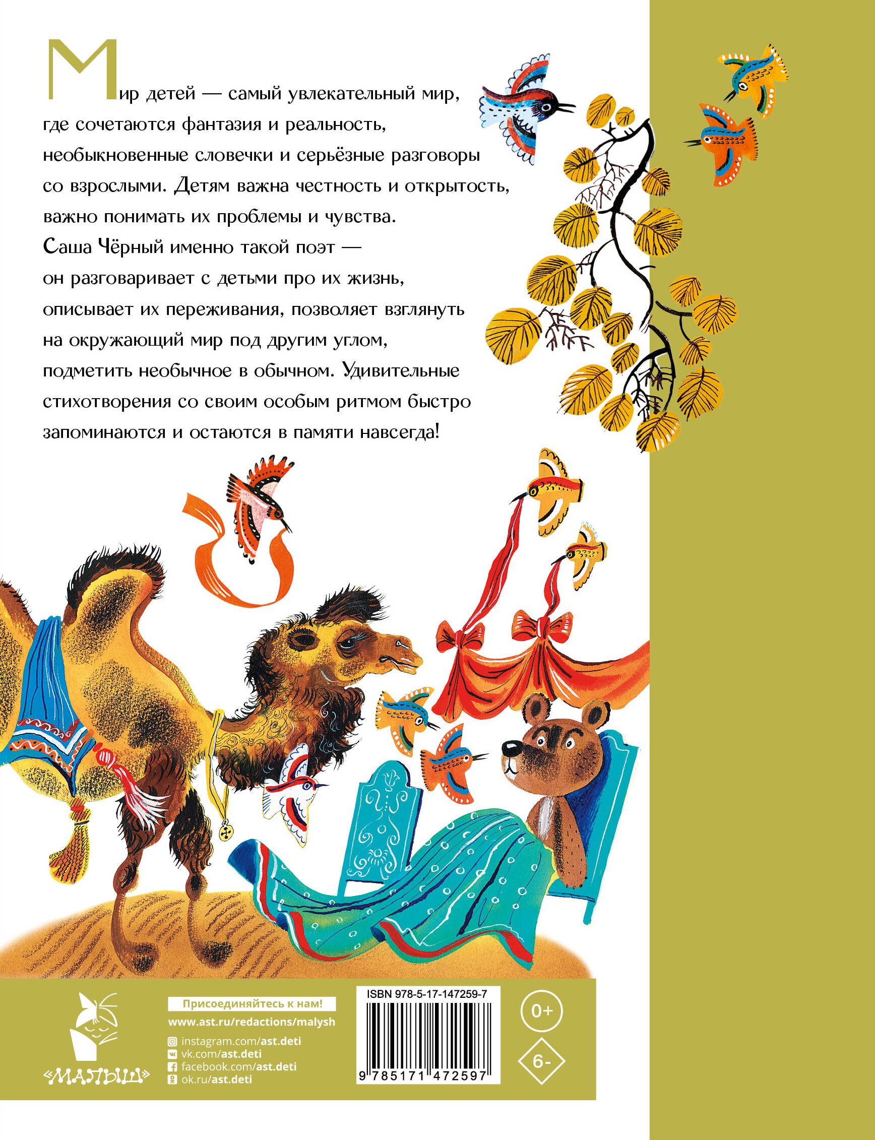 "Стихи для детей" Саши Чёрного - это прекрасная книга, собранная Корнеем Ивановичем Чуковским для детей и их родителей, бабушек и дедушек, которые любят озорные стихотворения, отражающие детский мир во всей его полноте. Стихи написаны о детях с таким тонким понимаем детской души, что в каждой строчке узнают- ся ситуации, которые происходили с каждым ребёнком: сломанная кукла, приставание к маме с миллионами вопросов, прогулка на природе… Стихи Саши Чёрного были рекомендованы К. И. Чуковским детям для чтения. А для родителей Корней Ива- нович написал, как Саша Чёрный стал детским писателем, а он - редактором стихов незаурядного поэта. Иллюстрации Александра Аземши погружают читателей в удивительный мир радостей и переживаний ре- бёнка, это - настоящие картины. Редакция получила рукопись от Елены Цезаревны Чуковской, внучки К. И. Чуковского. Для младшего школьного возраста.| Издательство | ИЗДАТЕЛЬСТВО "АСТ" |