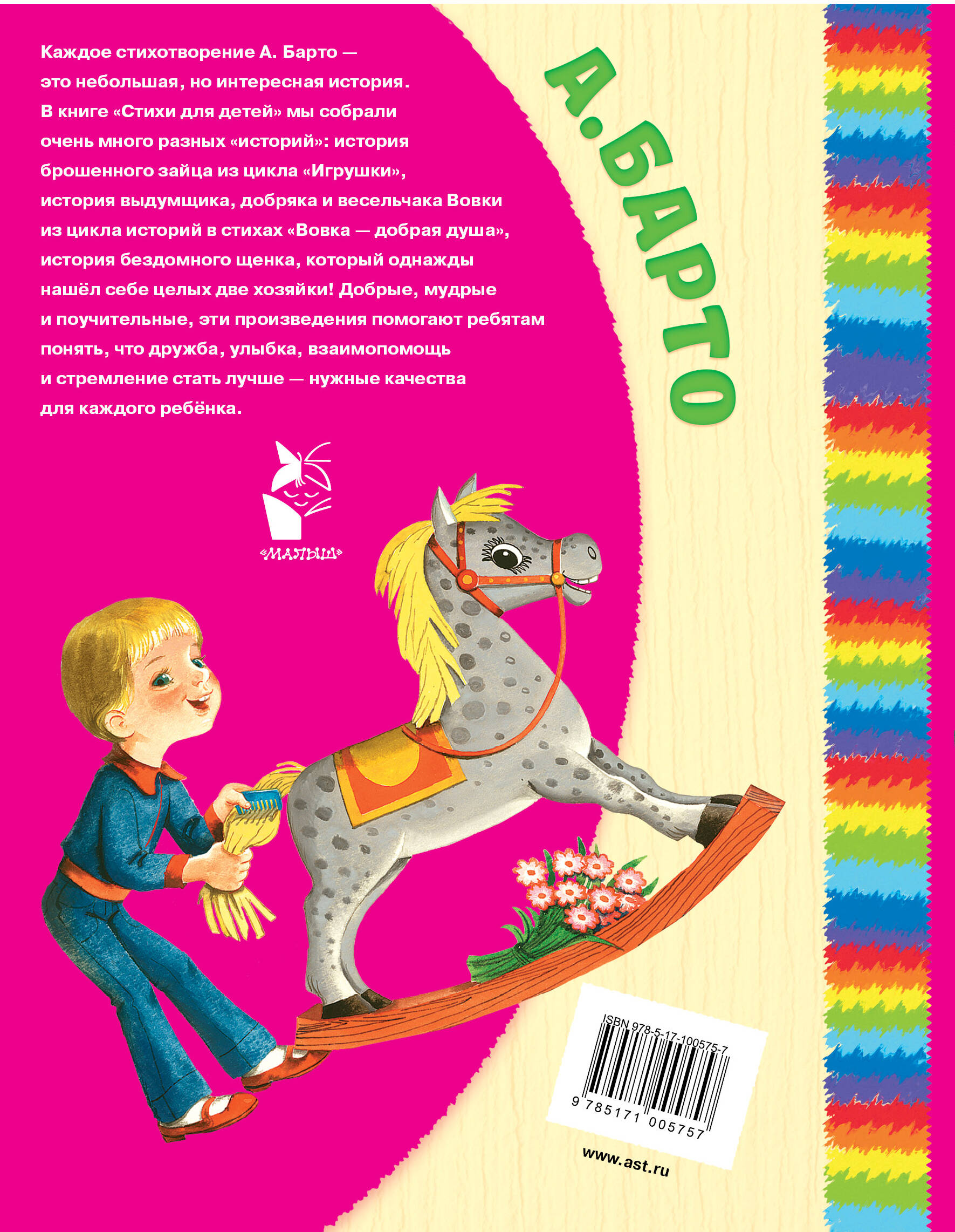 Каждое стихотворение А. Барто - это небольшая, но интересная история. В книге «Стихи для детей» мы собрали очень много разных «историй»: история брошенного зайца из цикла «Игрушки», история выдумщика, добряка и весельчака Вовки из цикла историй в стихах «Вовка - добрая душа», история бездомного щенка, который однажды нашёл себе целых двух хозяек! Добрые, мудрые и поучительные, эти произведения помогают ребятам понять, что дружба, улыбка, взаимопомощь и стремление стать лучше - нужные качества для каждого ребёнка.| Издательство | Издательство "АСТ" |