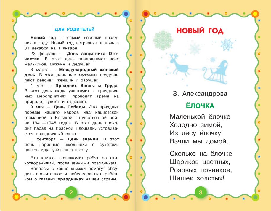 С помощью этой маленькой книжечки ребёнок познакомится со стихами о главных праздниках, которые отмечают и дома, и в детском саду. Стихотворения написаны замечательными отечественными поэтами. Ребёнок легко и с удовольствием выучит некоторые стихи и расскажет их на праздниках. Книгу открывает методическая подсказка для родителей, а вопросы в конце помогут побеседовать с ребёнком о праздниках.