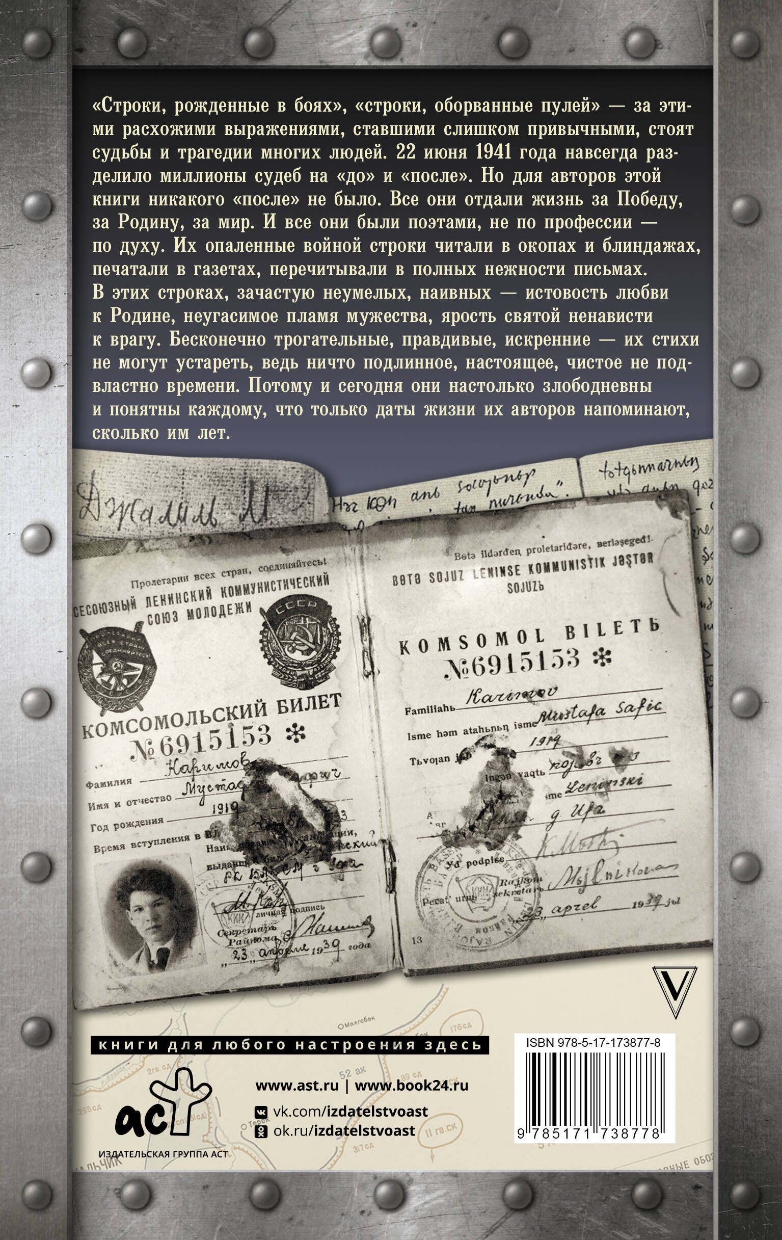 «Строки, рожденные в боях», «строки, оборванные пулей» - за этими расхожими выражениями, ставшими слишком привычными, стоят судьбы и трагедии многих людей. 22 июня 1941 года навсегда разделило миллионы судеб на «до» и «после». Но для авторов этой книги никакого «после» не было. Все они отдали жизнь за Победу, за Родину, за мир. И все они были поэтами, не по профессии - по духу. Их опаленные войной строки читали в окопах и блиндажах, печатали в газетах, перечитывали в полных нежности письмах. В этих строках, зачастую неумелых, наивных - истовость любви к Родине, неугасимое пламя мужества, ярость святой ненависти к врагу. Бесконечно трогательные, правдивые, искренние - их стихи не могут устареть, ведь ничто подлинное, настоящее, чистое не подвластно времени. Потому и сегодня они настолько злободневны и понятны каждому, что только даты жизни их авторов напоминают, сколько им лет.| Издательство | Издательство "АСТ" |