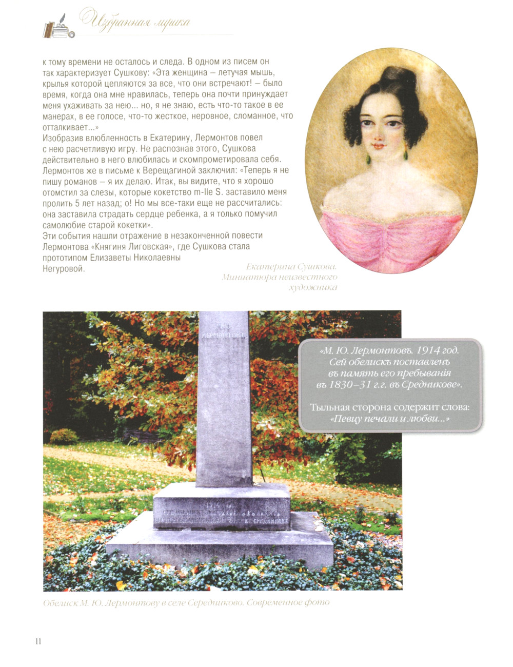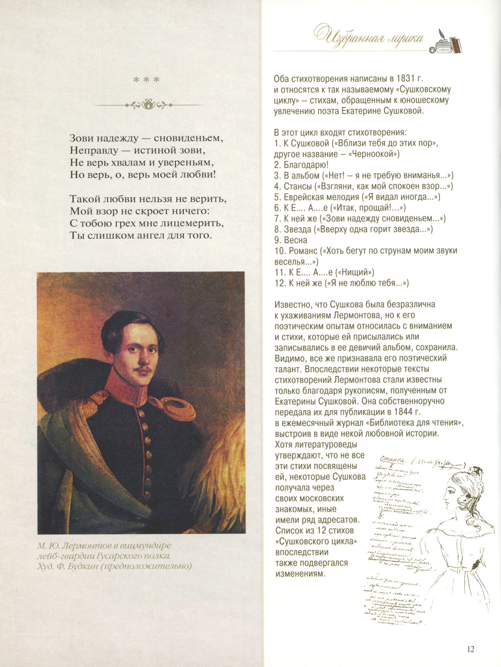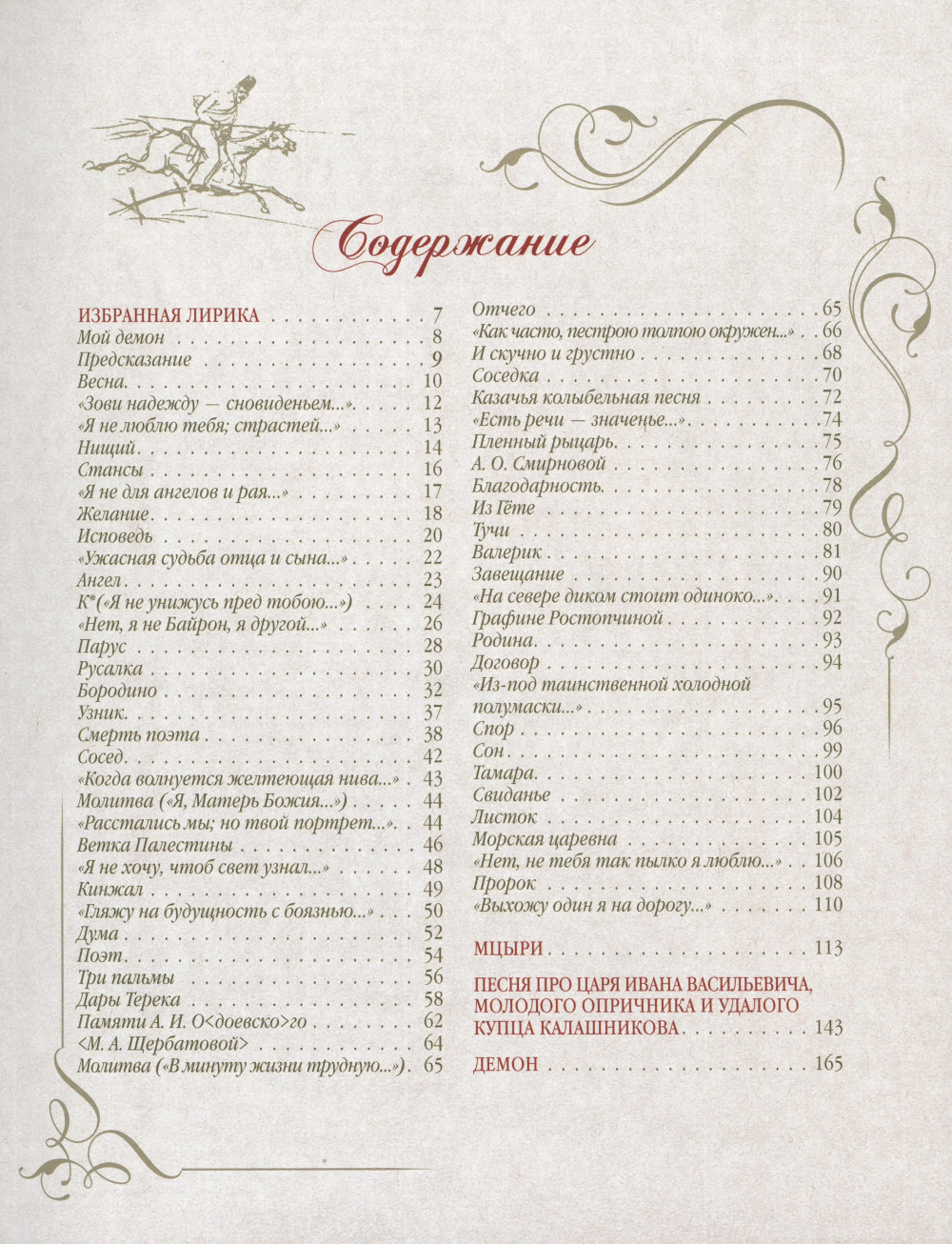 Эта уникальная книга позволит вам по-новому взглянуть на творчество любимого поэта. Вы узнаете об истории создания знаменитых поэм «Мцыри», «Песня про царя Ивана Васильевича, молодого опричника и удалого купца Калашникова», «Демон» и о местах и событиях, с ними связанных. Познакомитесь с адресатами лермонтовской лирики, прочитаете увлекательные рассказы о его друзьях и окружении, перед вами раскроются новые подробности биографии мятежного поэта, создавшего множество гениальных произведений за неполные двадцать семь лет жизни. Также вы увидите галерею шедевров изобразительного искусства, как созданных во время жизни поэта, так и вдохновленных его творчеством. В книге представлены три самые известные поэмы и шестьдесят лучших стихотворений Михаила Юрьевича Лермонтова с подробными комментариями к каждому произведению, иллюстрированные классикой русской и зарубежной живописи. Издание адресовано как взрослым любителям поэзии, так и школьникам.| Издательство | Просвещение-Союз |