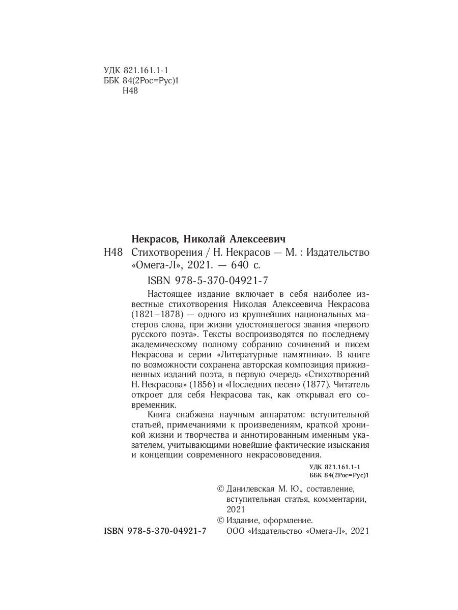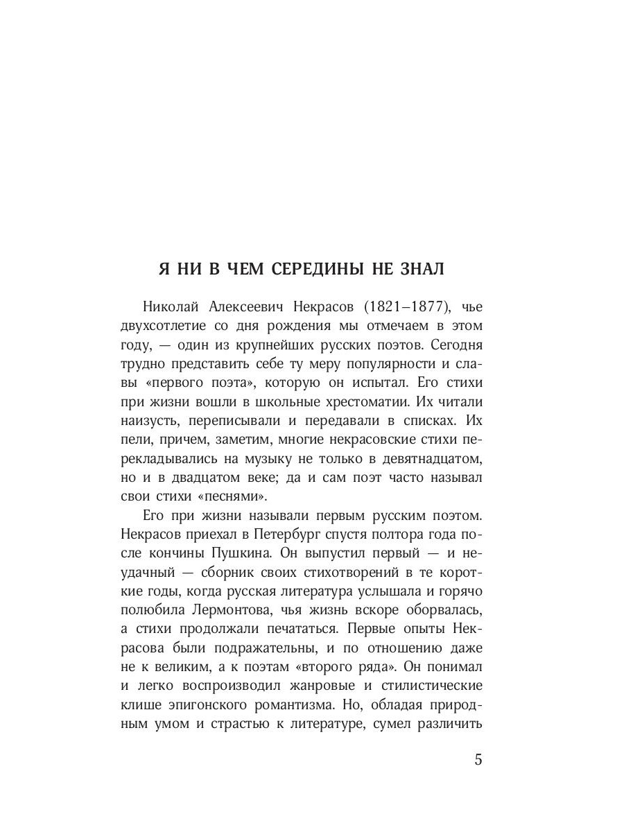 Настоящее издание включает в себя наиболее известные стихотворения Николая Алексеевича Некрасова (1821-1878) - одного из крупнейших национальных мастеров слова, при жизни удостоившегося звания «первого русского поэта». Тексты воспроизводятся по последнему академическому полному собранию сочинений и писем Некрасова и серии «Литературные памятники». В книге по возможности сохранена авторская композиция прижизненных изданий поэта, в первую очередь «Стихотворений Н. Некрасова» (1856) и «Последних песен» (1877). Читатель откроет для себя Некрасова так, как открывал его современник. Книга снабжена научным аппаратом: вступительной статьей, примечаниями к произведениям, краткой хроникой жизни и творчества и аннотированным именным указателем, учитывающими новейшие фактические изыскания и концепции современного некрасововедения.