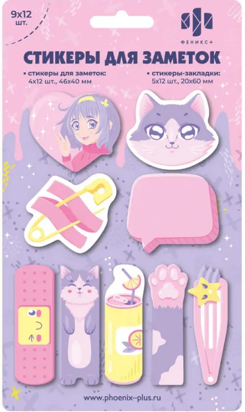 Стикеры-закладки бумажные, 46х40; 20х60 мм, 108 шт., КОТЫ (материал: бумага 80 г/м?, цвет: жёлтый, розовый, фиолетовый; кол-во листов: 108 л., форма: фигурная, декор: полноцветная печать, фигурная вырубка; наличие диспенсера: нет, индивидуальная упаковка: подложка с европодвесом из мелованного картона + ПЭТ-пакет)