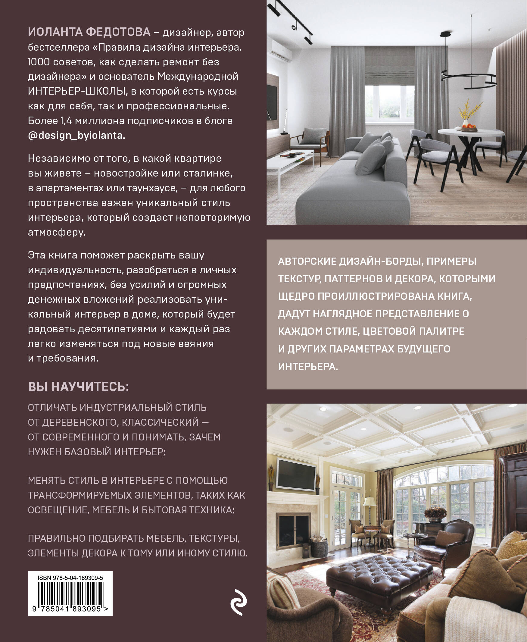 Независимо от того, в какой квартире вы живете - новостройке или сталинке, в апартаментах или таунхаусе, - для любого пространства важен уникальный стиль в интерьере, который создаст неповторимую атмосферу. Автор этой книги Иоланта Федотова - талантливый дизайнер, автор бестселлера «Правила дизайна интерьера. 1000 советов о том, как создать уникальный интерьер без помощи профессионала». Ее блог читает более миллиона подписчиков. Эта книга поможет вам раскрыть вашу индивидуальность, разобраться в ваших предпочтениях и создать уникальный интерьер в вашем доме без лишних затрат времени и денег. Такой интерьер будет радовать вас десятилетиями и легко адаптироваться под новые требования и тенденции. Вы научитесь: - различать разные стили интерьера; - изменять стиль интерьера с помощью трансформируемых элементов, таких как освещение, мебель и бытовая техника; - правильно подбирать мебель, текстуры и декор для каждого стиля; - создавать базовый интерьер, на который можно наслоить любой декор.| Издательство | ООО "Издательство "Эксмо" |
