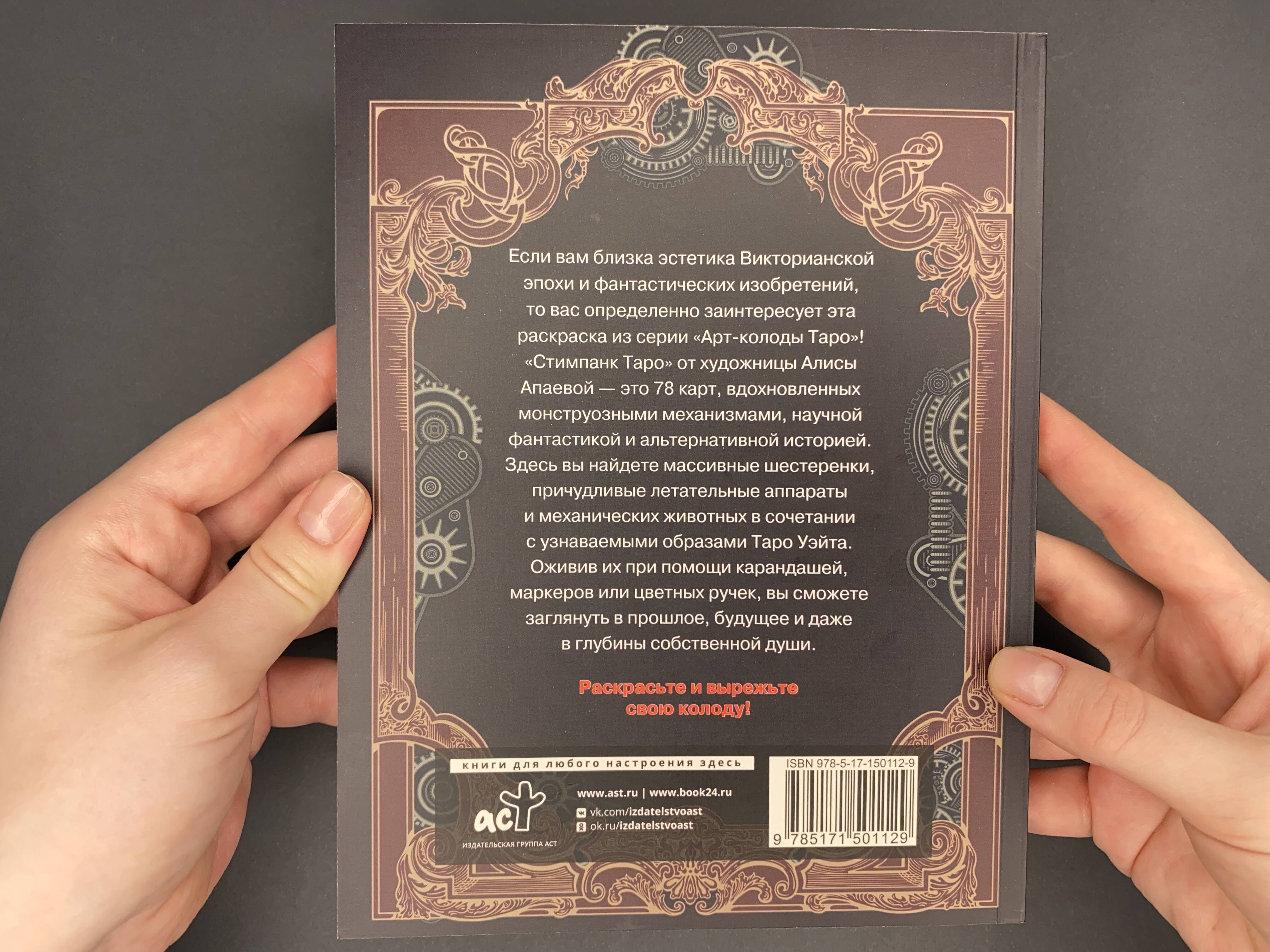 Если вам близка эстетика Викторианской эпохи и фантастических изобретений, то вас определенно заинтересует эта раскраска из серии "Арт-колоды Таро"! "Стимпанк Таро" от художницы Алисы Апаевой - это 78 карт, вдохновленных монструозными механизмами, научной фантастикой и альтернативной историей. Здесь вы найдете массивные шестеренки, причудливые летательные аппараты и механических животных в сочетании с узнаваемыми образами Таро Уэйта. Оживив их при помощи карандашей, маркеров или цветных ручек, вы сможете заглянуть в прошлое, будущее и даже в глубины собственной души. Раскрасьте и вырежьте свою колоду! • 78 контурных иллюстраций карт стандартного размера с рубашками на обороте. • Карты подготовлены специально для раскрашивания и последующего вырезания. • Сверхплотная офсетная бумага подходит для любых художественных материалов - от цветных карандашей и ручек до маркеров. Без просвечивания и отмарывания.| Издательство | ИЗДАТЕЛЬСТВО "АСТ" |
