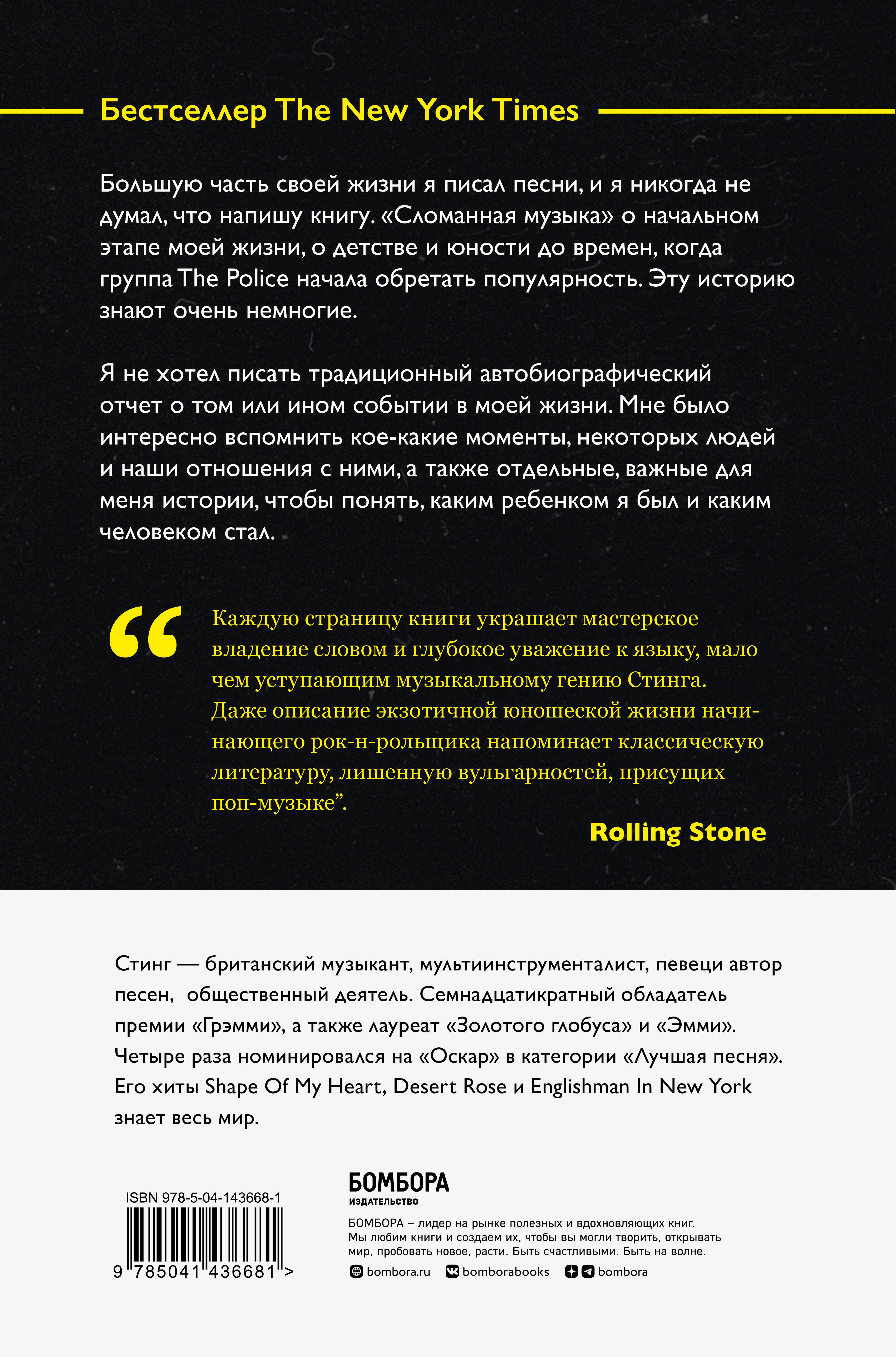 Бестселлер The New York Times. Искренняя, интеллектуальная и утонченная автобиография автора всемирно известных хитов Shape Of My Heart, Desert Rose и Englishman In New York. Стинг - музыкант, мультиинструменталист, певец, общественный деятель. Семнадцатикратный обладатель премии «Грэмми», а также лауреат «Золотого глобуса» и «Эмми». Четыре раза номинировался на «Оскар» в категории «Лучшая песня». Его мемуары рассказывают о детстве в захолустном городке, где он впервые влюбился в музыку, о том, как была создана группа The Police и как она распалась, о первых песнях, о дорогих ему людях и событиях, повлиявших на все творчество Стинга, и, конечно, о признании и предназначении. Он отправляет читателя в затягивающее путешествие по Ньюкаслу 50-х, 60-х и 70-х годов, рассказывая закулисную жизнь британского шоу-бизнеса. Проникновенная история от первого лица, позволяющая увидеть, почему песни Стинга столь мистичны и поучительны, и понять, кто же такой Гордон Самнер на самом деле. «Каждую страницу книги украшает мастерское владение словом и глубокое уважение к языку, мало чем уступающим музыкальному гению Стинга. Даже описание юношеской жизни начинающего рок-н-рольщика напоминает классическую литературу, лишенную вульгарностей, присущих поп-музыке». - Rolling Stone «"Сломанная музыка" оставляет ощущение личного катарсиса, что редко встречается в изданиях этого жанра… Вдумчивая и удивительная». - London Spectator| Издательство | ООО "Издательство "Эксмо" |