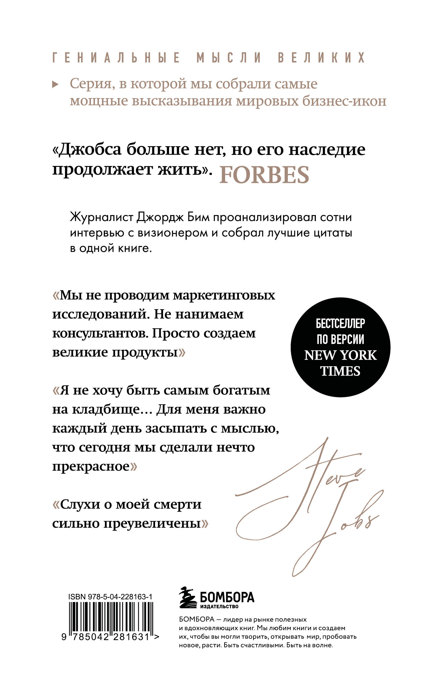 Стив Джобс: - Американский изобретатель и промышленный дизайнер, сооснователь корпорации Apple и генеральный директор Pixar. - Лучший CEO планеты по версии Harvard Business. - Визионер, бизнес-магнат и отец цифровой революции. «Гениальные мысли великих» - это серия, в которой мы собрали самые мощные мысли мировых бизнес-икон. Журналист Джордж Бим проанализировал сотни интервью с визионером и собрал лучшие цитаты в одной книге: - «Мы не проводим маркетинговых исследований. Не нанимаем консультантов. Просто создаем великие продукты». - «Слухи о моей смерти сильно преувеличены». - «Я не хочу быть самым богатым на кладбище… Для меня важно каждый день засыпать с мыслью, что сегодня мы сделали нечто прекрасное».| Издательство | ООО "Издательство "Эксмо" |