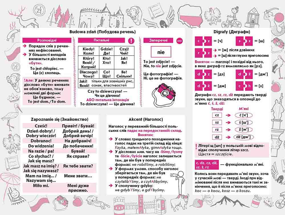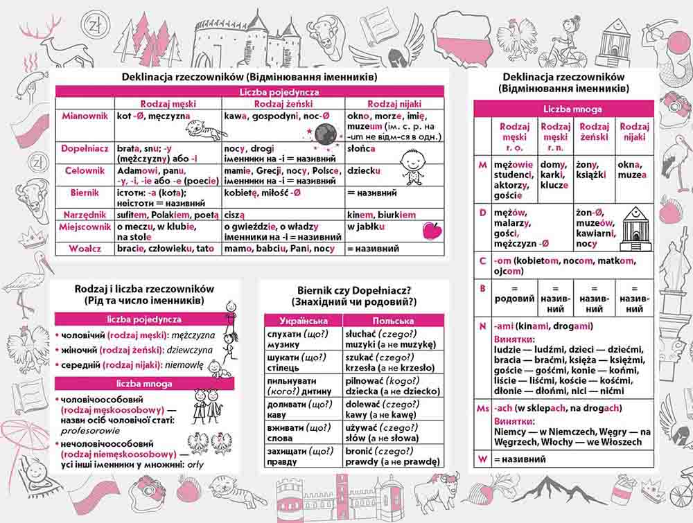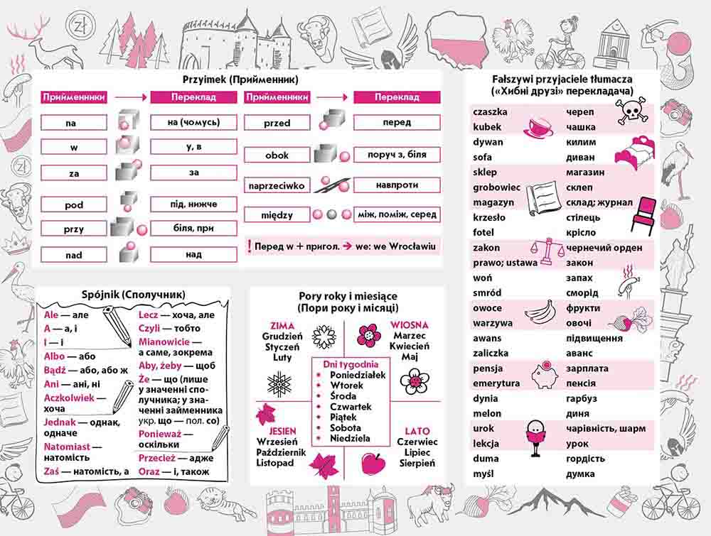 Стікербук-довідник - це базові теми польської мови у схемах, символах та інфографіці. Один стікер = одна тема. Практичний формат книги сприяє найкращому запам'ятовуванню інформації. Посібник містить 32 наліпки. Їх можна наклеїти на підставку з обкладинки цієї ж книги, на зошит, обгортку підручника або будь-який інший предмет, що завжди перед очима. Зорова пам'ять вважається найбільш розвиненою, тому такий спосіб навчання дасть гарантований результат. Крім основних тем із граматики польської мови, стікербук містить також важливу для запам'ятовування лексику: кольори, цифри, час, дні тижня тощо. Сучасний ілюстрований посібник із наліпками стане гарним подарунком для тих, хто тільки починає вивчати польську мову. Стікербуки - знання, що самі липнуть до учнів!| ISBN | 978-617-7385-78-2 |