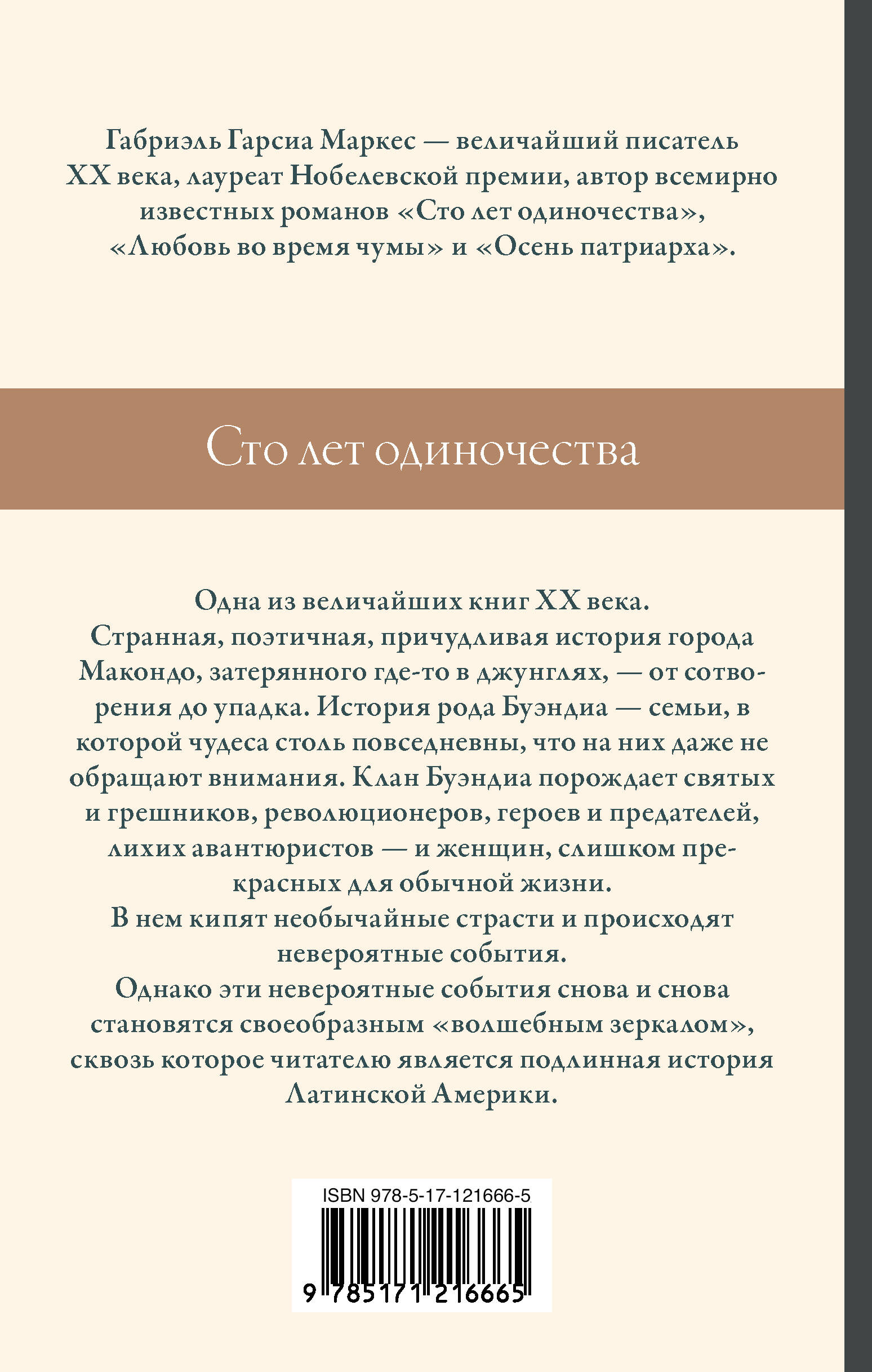Одна из величайших книг ХХ века. Странная, поэтичная, причудливая история города Макондо, затерянного где-то в джунглях, - от сотворения до упадка. История рода Буэндиа - семьи, в которой чудеса столь повседневны, что на них даже не обращают внимания. Клан Буэндиа порождает святых и грешников, революционеров, героев и предателей, лихих авантюристов - и женщин, слишком прекрасных для обычной жизни. В нем кипят необычайные страсти - и происходят невероятные события. Однако эти невероятные события снова и снова становятся своеобразным "волшебным зеркалом", сквозь которое читателю является подлинная история Латинской Америки…| Издательство | ИЗДАТЕЛЬСТВО "АСТ" |