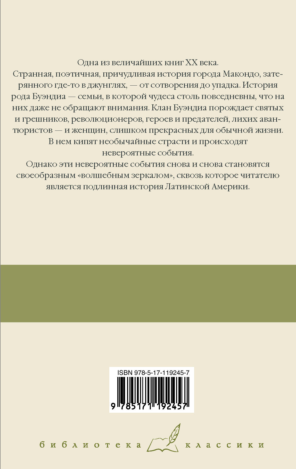 Габриэль Гарсиа Маркес - величайший писатель ХХ века, лауреат Нобелевской премии, автор всемирно известных романов "Сто лет одиночества", "Любовь во время чумы" и "Осень патриарха". Одна из величайших книг ХХ века. Странная, поэтичная, причудливая история города Макондо, затерянного где-то в джунглях, - от сотворения до упадка. История рода Буэндиа - семьи, в которой чудеса столь повседневны, что на них даже не обращают внимания. Клан Буэндиа порождает святых и грешников, революционеров, героев и предателей, лихих авантюристов - и женщин, слишком прекрасных для обычной жизни. В нем кипят необычайные страсти - и происходят невероятные события. Однако эти невероятные события снова и снова становятся своеобразным "волшебным зеркалом", сквозь которое читателю является подлинная история Латинской Америки…