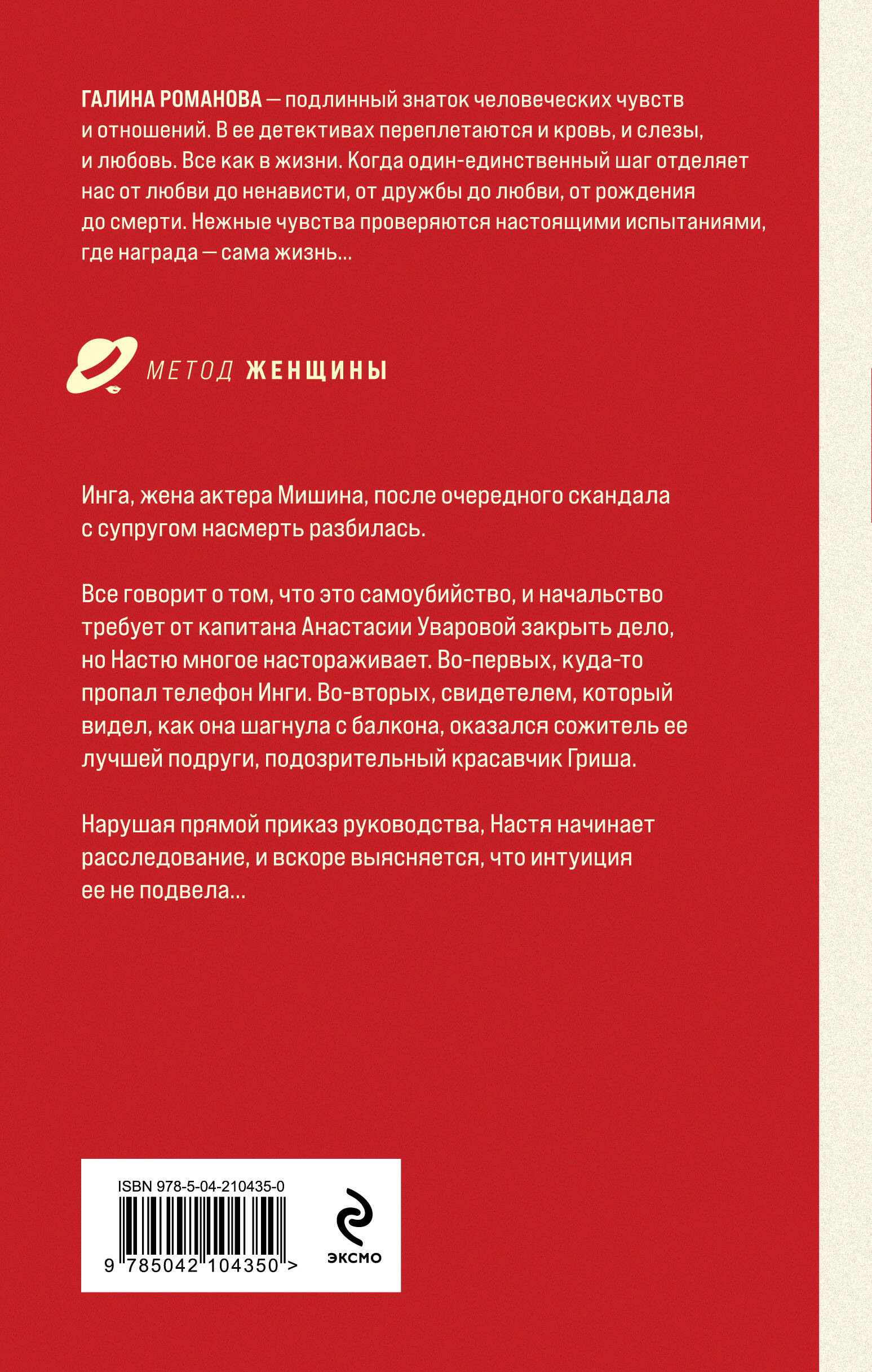 Инга, жена актера Мишина, после очередного скандала с супругом насмерть разбилась. Все говорит о том, что это самоубийство, и начальство требует от капитана Анастасии Уваровой закрыть дело, но Настю многое настораживает. Во-первых, куда-то пропал телефон Инги. Во-вторых, свидетелем, который видел, как она шагнула с балкона, оказался сожитель ее лучшей подруги, подозрительный красавчик Гриша. Нарушая прямой приказ руководства, Настя начинает копать, и вскоре выясняется, что интуиция ее не подвела… Галина Романова - подлинный знаток человеческих чувств и отношений. В ее детективных мелодрамах из серии «Метод женщины» переплетаются и кровь, и слезы, и любовь. Все, как в реальности, когда один-единственный шаг отделяет нас от любви до ненависти, от дружбы до любви, от рождения до смерти. Нежные чувства проверяются настоящими испытаниями, где награда - сама жизнь.| Издательство | ООО "Издательство "Эксмо" |