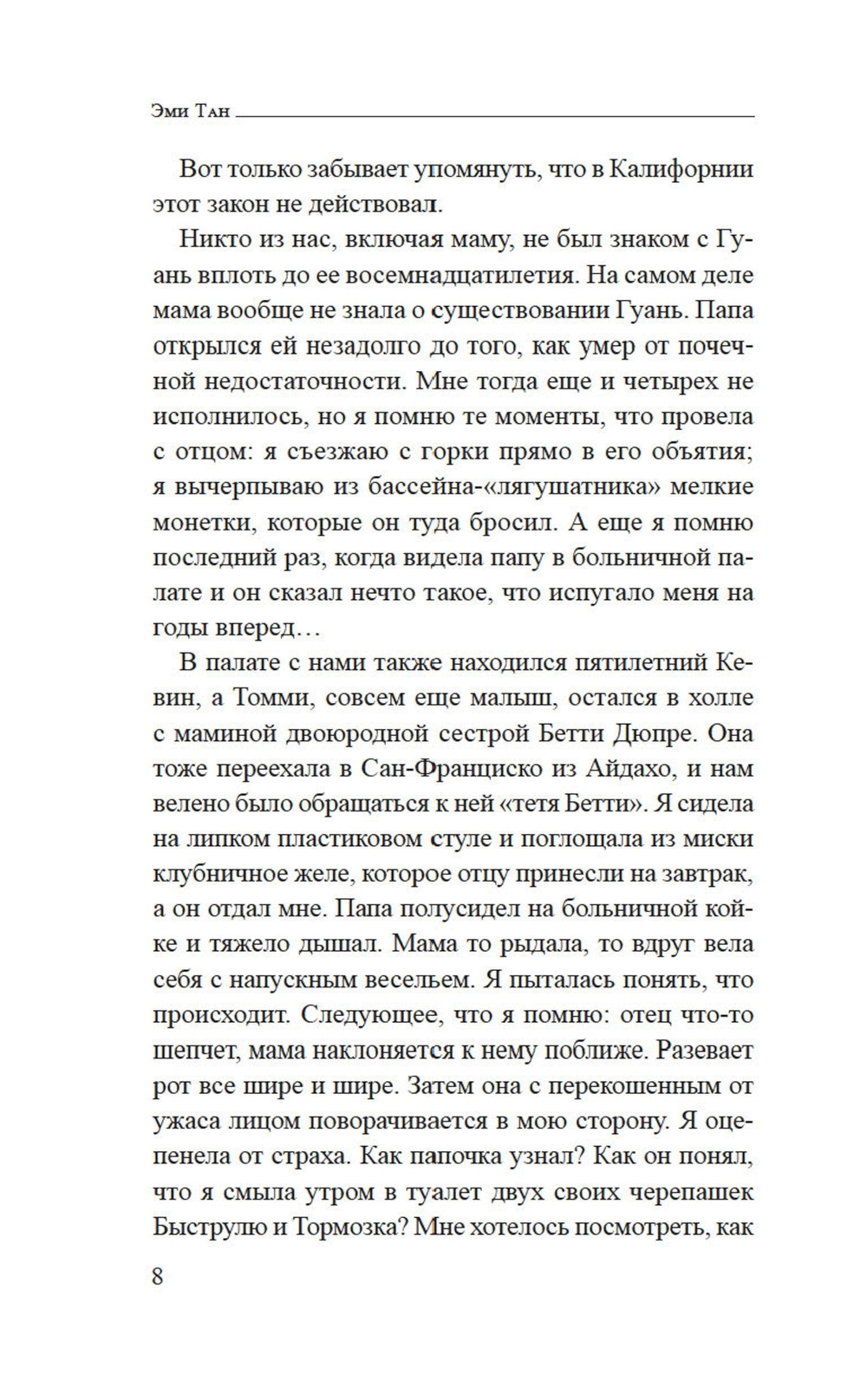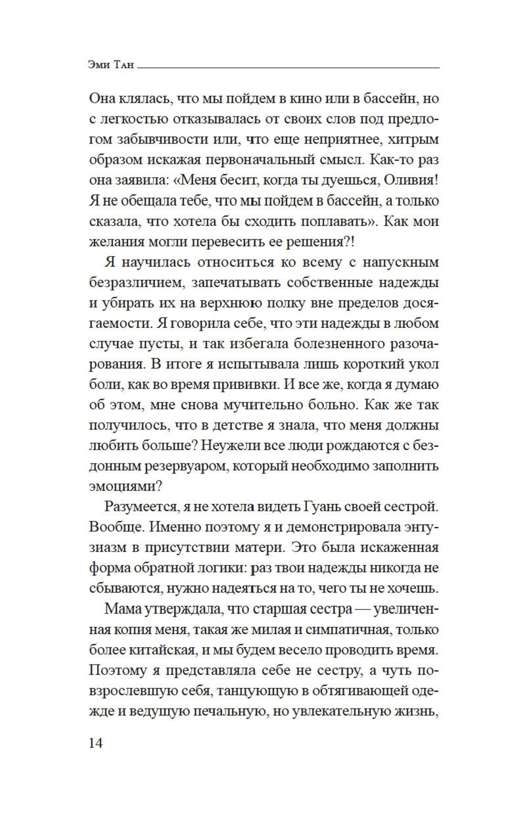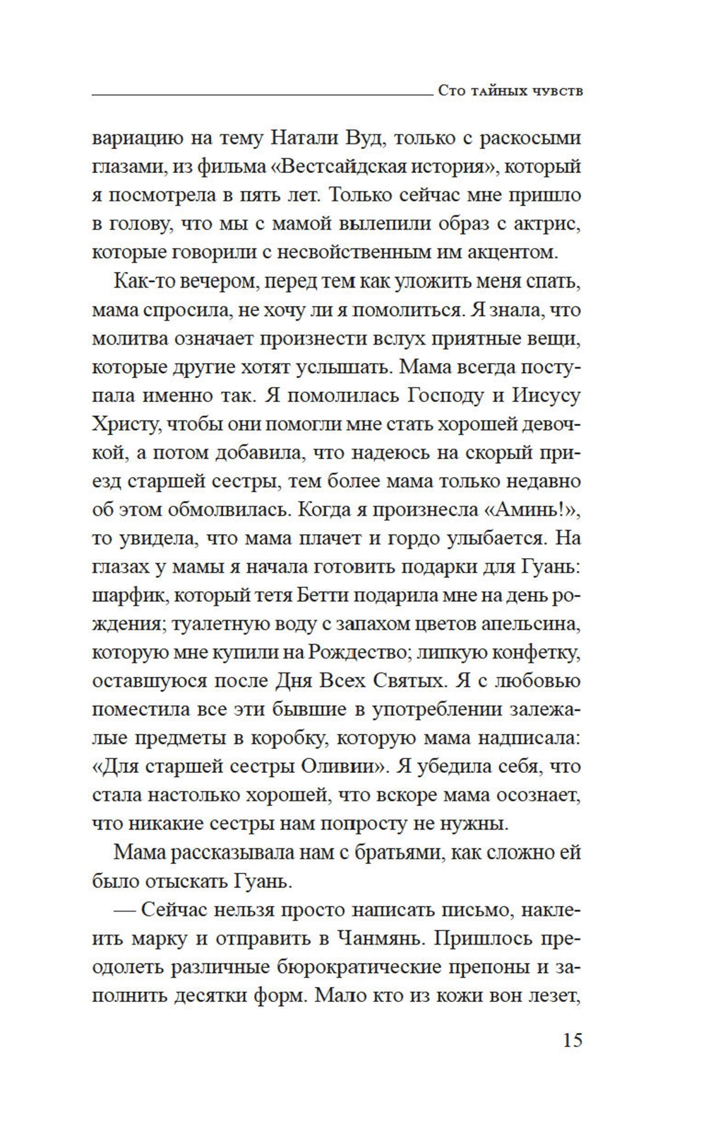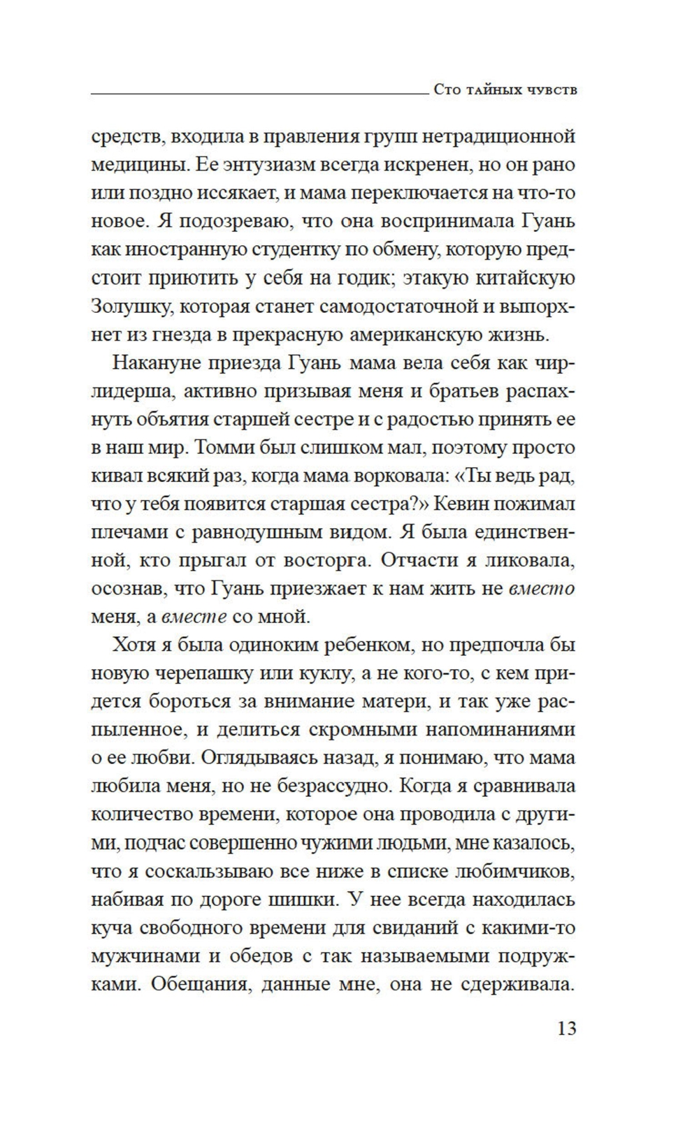 Сан-Франциско, 1962 год. Шестилетняя Оливия напугана: ей сказали, что отныне в доме поселится старшая дочь папы, которую привезут из китайской деревни. «Она будет здесь жить вместо меня?» - «Нет, конечно! Вместе с тобой». Однако девочка не может побороть недоверчивое отношение к сестре. Во-первых, Гуань плохо говорит по-английски, во-вторых, утомляет Оливию своей бесконечной любовью… А еще Гуань утверждает, что может общаться с духами умерших людей. Уж не сумасшедшая ли она? Прошли годы. Сестры давно живут отдельно, но Гуань, к недовольству Оливии, по-прежнему бесконечно привязана к ней. Все меняется, когда женщины вместе едут в Китай, на родину Гуань. Именно здесь, в глухой деревушке, Оливии предстоит узнать истинную ценность чувств старшей сестры, а также понять мотивы многих ее поступков. Тайное постепенно становится явным…| Издательство | Иностранка |
