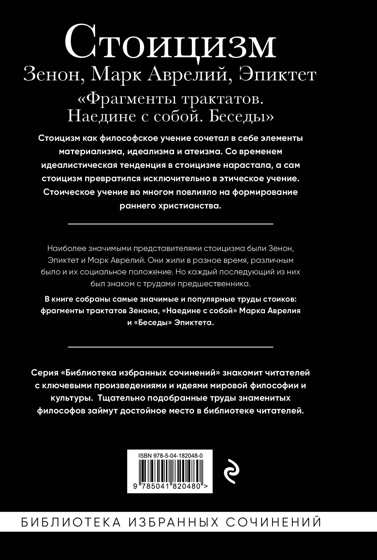 Наиболее значимыми представителями стоицизма были Зенон, Эпиктет и Марк Аврелий. Они жили в разное время, различным было и их социальное положение. Но каждый последующий из них был знаком с трудами предшественника. В книге собраны самые значимые и популярные труды стоиков: Фрагменты трактатов Зенона, «Наедине с собой» Марка Аврелия и Беседы Эпиктета.| Издательство | ООО "Издательство "Эксмо" |