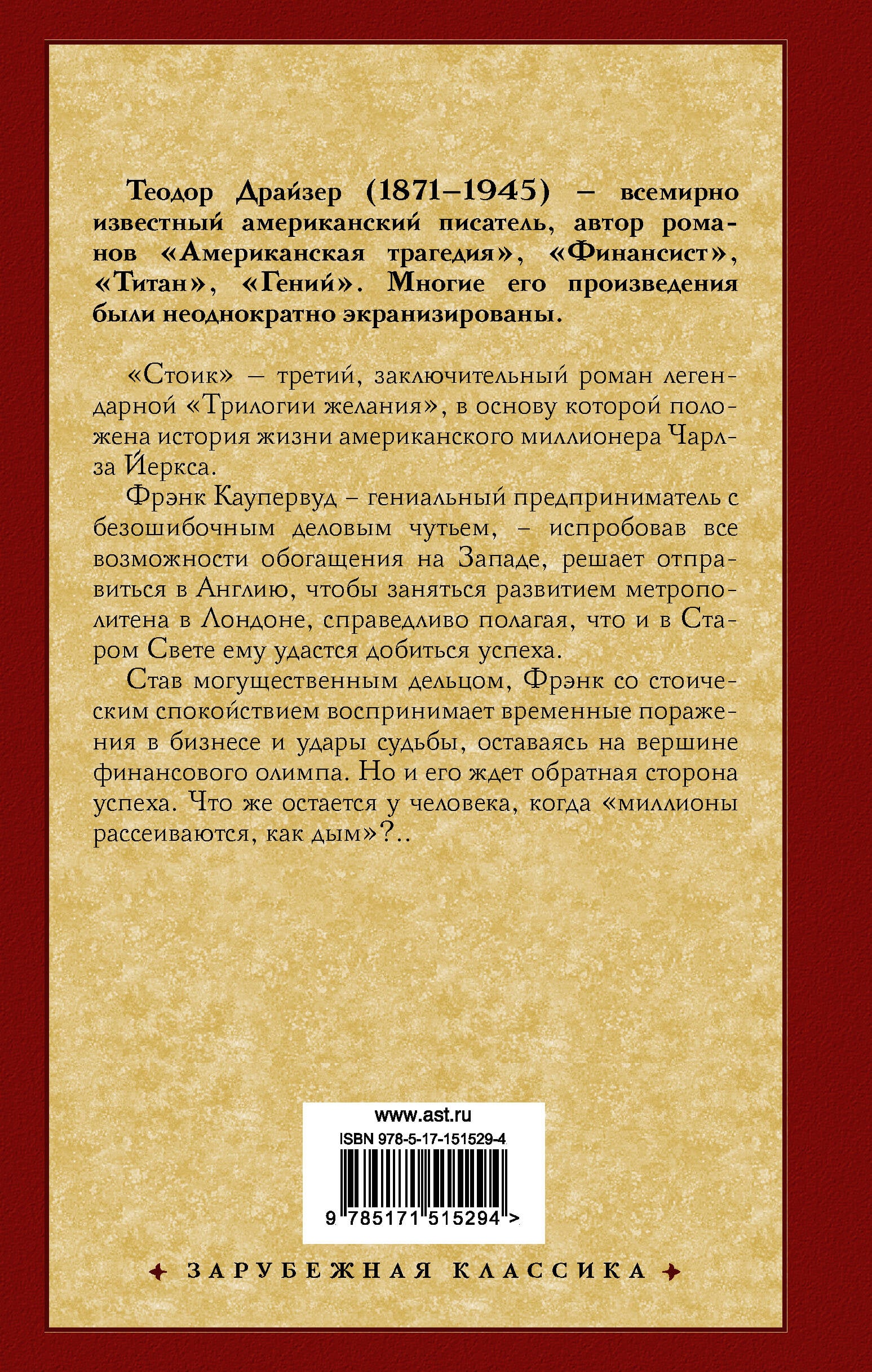 "Стоик" - третий, заключительный роман легендарной "Трилогии желания", в основу которой положена история жизни американского миллионера Чарлза Йеркса. Фрэнк Каупервуд - гениальный предприниматель с безошибочным деловым чутьем, испробовав все возможности обогащения на Западе, решает отправиться в Англию, чтобы заняться развитием метрополитена в Лондоне, справедливо полагая, что и в Старом Свете ему удастся добиться успеха. Став могущественным дельцом, Фрэнк со стоическим спокойствием воспринимает временные поражения в бизнесе и удары судьбы, оставаясь на вершине финансового олимпа… Но и его ждет обратная сторона успеха. Что же остается у человека, когда "миллионы рассеиваются, как дым"?..| Издательство | ИЗДАТЕЛЬСТВО "АСТ" |