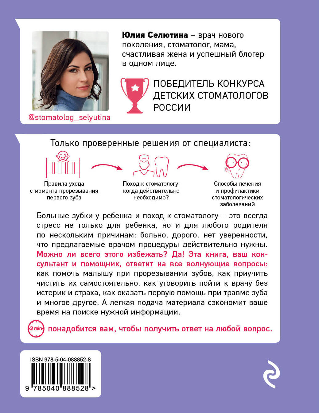 Юлия Селютина - детский стоматолог, победитель конкурса Детских стоматологов России, популярный блогер stomatolog_selyutina (более 500 000 читателей!) Прочитав эту книгу, вы узнаете: - нужно ли лечить молочные зубы; - как помочь ребенку при прорезывании зубов; - Как приучить малыша чистить зубы; - в каких случаях ребенку нужны брекеты; - кариес, какие осложнения бывают и что с ними делать; - когда необходимо обращаться к стоматологу; - что и когда делать, чтобы улыбка вашего малыша в будущем была красивой; и многое, многое другое. А удобная навигация книги, разделенная по возрастам ребенка, поможет вам в этом. Фишки книги «У детей зубы не болят и не нужно их лечить, все равно выпадут» - этот крепко засевший в головах стереотип давно уже устарел! Здоровые зубки вашего ребенка влияют не только на внешний вид, но и на его речь в дальнейшем. Поэтому так важно лечить и ухаживать за полостью рта с раннего возраста. Юлия Селютина рассмотрит проблемы, волнующие родителей в современном технологичном мире, и предложит не менее современные решения. Четкая и логичная структура, благодаря которой вам будет легко найти нужную тему, множество иллюстраций, инфографика, простые, но эффективные рекомендации - все это делает книгу вашим незаменимым помощником. Для кого эта книга Для родителей, которые хотят разобраться, в каких случаях можно помочь ребенку самим, а в каких - обращаться за помощью к специалисту. Для родителей, которые устали «лопатить» интернет в поисках проверенного решения. Для тех, кто не знает, что подарить будущим родителям: книга «Стоматолог Селютина, у меня вопрос: как заботиться о детских зубах?» - станет полезным и нужным подарком. Анна Левадная (doctor_annamama), педиатр, к.м.н.: «Уход за зубами своих детей я доверяю Юлии и ценю ее адекватный, современный и игровой подход к ребенку! Благодаря этой книге родители наконец-то узнают, какие стоматологические процедуры необходимы малышу, а также о том, как научить его с раннего возраста ухаживать за своими зубками и беречь их. Теперь поход к стоматологу с ребенком перестанет быть для вас ожившим кошмаром!»| Издательство | ООО "Издательство "Эксмо" |