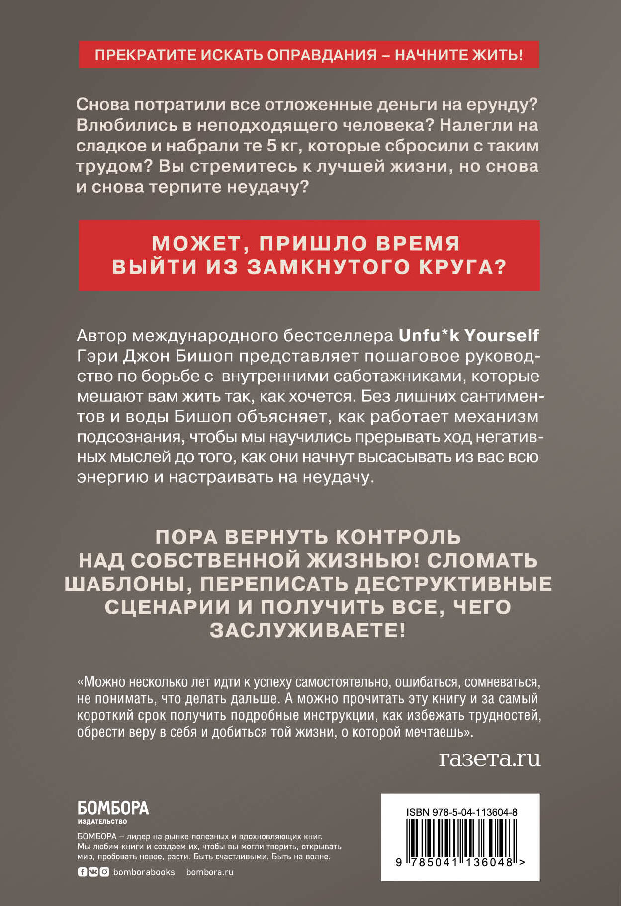 Прекратите искать оправдания - начинайте жить! Снова потратили все отложенные деньги на ерунду? Влюбились в неподходящего человека? Налегли на сладкое и набрали те 5 кг, которые сбросили с таким трудом? Вы стремитесь к лучшей жизни, но снова и снова терпите неудачу? Может, пришло время выйти из замкнутого круга? Автор международного бестселлера Unfu*k Yourself Гэри Джон Бишоп представляет пошаговое руководство по борьбе с внутренними саботажниками, которые мешают вам жить той жизнью, которой хочется. Без лишних сантиментов и воды Бишоп объясняет, как работает механизм подсознания, чтобы мы научились прерывать ход негативных мыслей до того, как они начнут высасывать из нас всю энергию и настраивать на неудачу. Пора вернуть контроль над собственной жизнью! Сломать шаблоны, переписать деструктивные сценарии и получить все, чего заслуживаете!| Издательство | ООО "Издательство "Эксмо" |