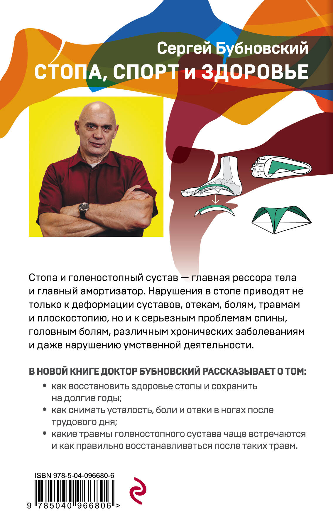 Дополненное издание популярной книги доктора Бубновского «Здоровье через стопы» в новом ярком оформлении. Автор переработал и дополнил текст книги, ориентируюсь на молодежную аудиторию. Сергей Бубновский рассказывает о том, как снимать усталость, боли и отеки в ногах после трудового дня, какие травмы голеностопного сустава чаще встречаются в повседневной жизни и спорте и как правильно восстанавливаться после таких травм. Стопа и голеностопный сустав - главная рессора тела и главный амортизатор. Нарушения в стопе приводят к таким серьезным проблемам, как боли в спине, головные боли, различным хроническим заболеваниям и даже нарушению умственной деятельности. - Как правильно бегать? - Высокие каблуки или здоровые ноги? - Стопа и головные боли: есть ли связь? - Реабилитация стопы после спортивных травм.| Издательство | ООО "Издательство "Эксмо" |