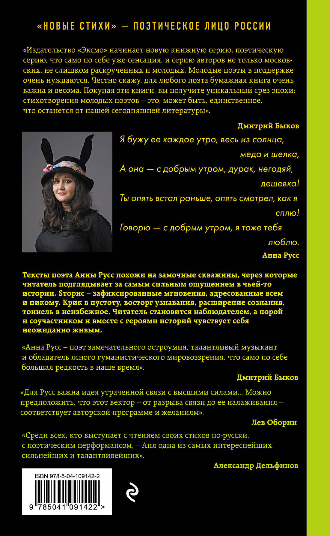 Тексты поэта Анны Русс похожи на замочные скважины, через которые читатель подглядывает за самым сильным ощущением в чьей-то истории. Sторис - зафиксированные мгновения, адресованные всем и никому. Крик в пустоту, восторг узнавания, расширение сознания, тоннель в неизбежное. Читатель становится наблюдателем, а порой и соучастником, и вместе с героями историй чувствует себя неожиданно живым.