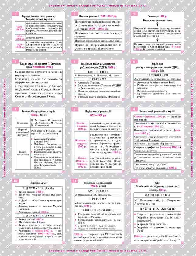 У довіднику «Історія України. 10-11 клас» представлені історичні події на території України у ХХ столітті. 96 багаторазових наліпок містять дані в хронологічному порядку, тут представлені такі теми як: революція 1905 року, аграрна реформа Столипіна, Перша світова війна, Друга світова війна і багато інших знакові подій епохи. Методичний посібник у вигляді наліпок істотно полегшує запам'ятовування дат, оскільки інформацію завжди можна взяти з собою і часто повторювати. Кожній темі будь-то Другий Універсал, ЗУНР або Гетьманський переворот присвячений окремий блок. Всі дані структуровані в таблиці, дати виділені контрастним кольором, а найбільш значущі події і терміни виділені жирним шрифтом. Подібна організація інформації істотно поліпшує її візуальне сприйняття, а значить підвищує ефективність навчання. Завдяки всебічному підходу у школяра формується цілісна картина і більш глибоке розуміння предмета. Довідник у наліпках буде особливо зручний при підготовці до контрольних робіт, ЗНО та ДПА. У разі необхідності його зручно взяти з собою на тест і отримати експрес-допомогу.| ISBN | 978-966-262-323-9 |