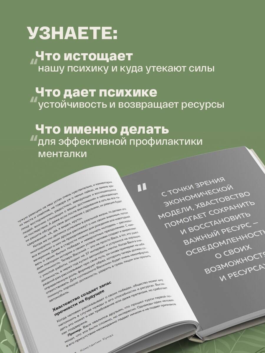 Все, что нас не убивает, не делает нас сильнее. А просто медленнее истощает нашу психику. После чего мы судорожно пытаемся восстановиться, и такое состояние становится для нас привычной реальностью. И в этой книге Константин Кунах, психолог-консультант, рассказывает, как не надо обращаться со своими ресурсами и как можно оставаться эффективным и счастливым без перегрузок нервной системы. В этой книге-инструкции вы найдете настоящий гайд по эксплуатации ментального здоровья, а еще узнаете: - почему иногда, казалось бы, обыденные вещи высасывают из нас все силы; - как не истощать себя до прокрастинации и сохранять эмоциональный тонус; - почему мы чувствуем, что всё плохо, хотя явных причин нет; - как вырваться из порочного круга самоедства и перестать ставить себе палки в колеса. ОТЗЫВ: «Нас с детства приучали к гигиене - к заботе о чистоте и здоровье тела. А вот о психогигиене никто не рассказывал, хотя это не менее важное знание для человека. Психогигиена, которой посвящена эта книга, предполагает заботу о своем внутреннем мире, поддержание порядка и гармонии в нем. С помощью простых и вместе с тем действенных практик автор помогает вам разобраться в устройстве собственной психики и поддерживать ресурсное состояние день за днем». - Ирина Тева Кумар, интегративный психолог, преподаватель Московского института психоанализа «Не все могут взойти на Эверест, но всегда можно выяснить, что за потребность человек пытается удовлетворить таким способом, и найти подходящее желание». «Более счастливы те люди, потребности которых связаны с заботой о других, ощущением своего вклада в общее дело, в мир, в человечество, в близких - но только когда их потребности удовлетворены». «Скрытые мысли проявляются не столько в содержании речи, сколько в подаче этого содержания - какими словами он называет те или иные понятия, в каком порядке эти слова идут». «Становится понятно, почему я со всеми конфликтую: оказывается, то, что я считал спокойным предъявлением претензий, со стороны выглядит как агрессивная истерика». «Мы должны к собственным догадкам относиться так же скептически, как к чужим». «И только кризисы, депрессии, невротические симптомы и манифестация заболеваний могут заставить человека обратить внимание на то, что знакомство с собой не закончено».| Издательство | ООО "Издательство "Эксмо" |