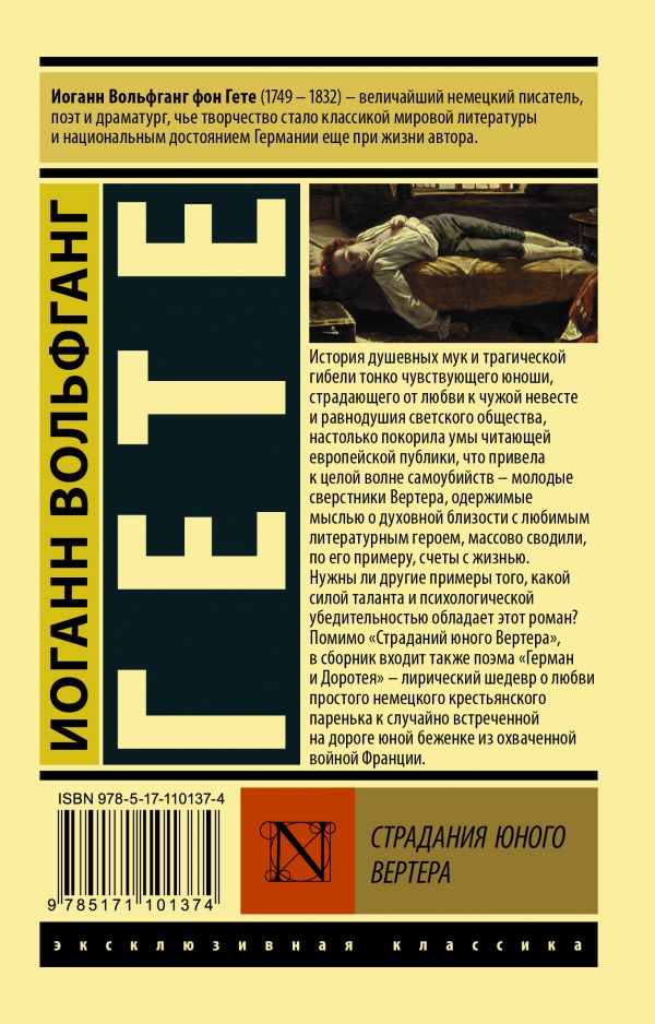 История душевных мук и трагической гибели тонко чувствующего юноши, страдающего от любви к чужой невесте и равнодушия светского общества, настолько покорила умы читающей европейской публики, что привела к целой волне самоубийств, - молодые сверстники Вертера, одержимые мыслью о духовной близости с любимым литературным героем, массово сводили, по его примеру, счеты с жизнью. Нужны ли другие примеры того, какой силой таланта и психологической убедительностью обладает этот роман? Помимо "Страданий юного Вертера", в сборник входит также поэма "Герман и Доротея", - лирический шедевр о любви простого немецкого крестьянского паренька к случайно встреченной на дороге юной беженке из охваченной войной Франции.