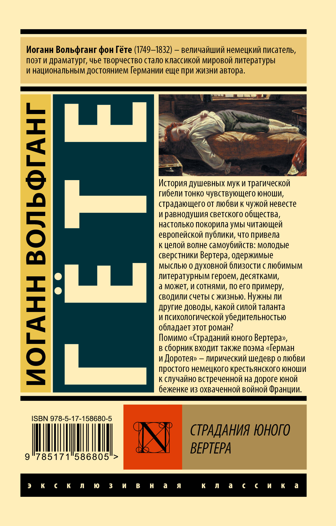 История душевных мук и трагической гибели тонко чувствующего юноши, страдающего от любви к чужой невесте и равнодушия светского общества, настолько покорила умы читающей европейской публики, что привела к целой волне самоубийств - молодые сверстники Вертера, одержимые мыслью о духовной близости с любимым литературным героем, десятками, а может, и сотнями, по его примеру, сводили счеты с жизнью. Нужны ли другие доводы, какой силой таланта и психологической убедительностью обладает этот роман? Помимо "Страданий юного Вертера", в сборник входит также поэма "Герман и Доротея", - лирический шедевр о любви простого немецкого крестьянского юноши к случайно встреченной на дороге юной беженке из охваченной войной Франции.| Издательство | ИЗДАТЕЛЬСТВО "АСТ" |