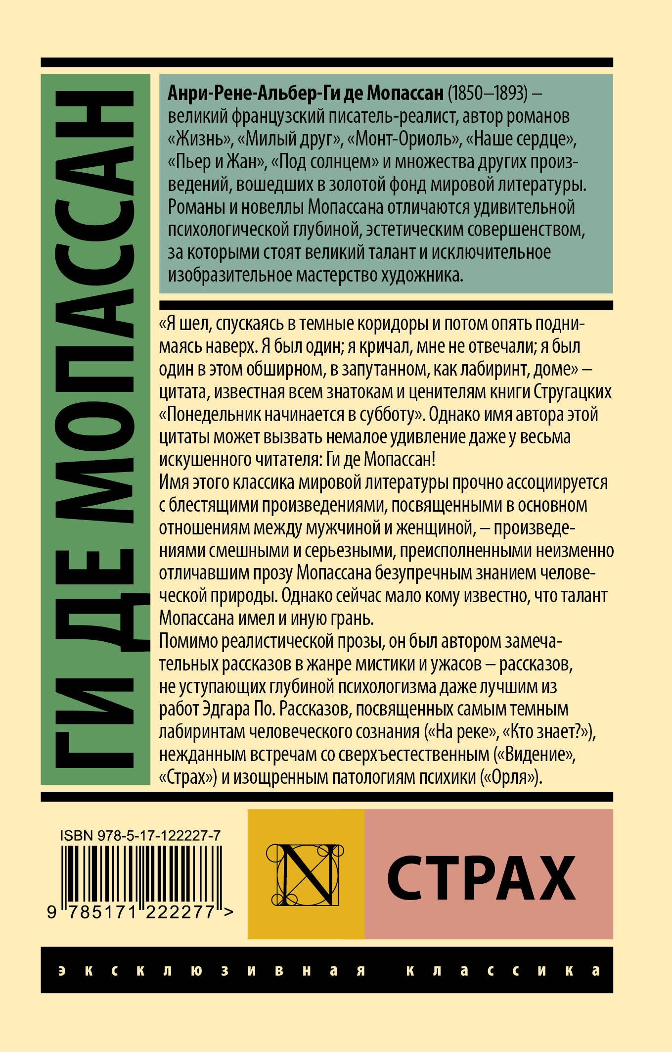 Я шел, спускаясь в темные коридоры и потом опять поднимаясь наверх. Я был один; я кричал, мне не отвечали; я был один в этом обширном, запутанном, как лабиринт, доме" - цитата, известная всем знатокам и ценителям книги Стругацких "Понедельник начинается в субботу". Однако имя автора этой цитаты может вызвать немалое удивление даже у весьма искушенного читателя: Ги де Мопассан! Имя этого классика мировой литературы прочно ассоциируется с блестящими произведениями, посвященными в основном отношениям между мужчиной и женщиной, - произведениями смешными и серьезными, преисполненными неизменно отличавшим прозу Мопассана безупречным знанием человеческой природы. Однако сейчас мало кому известно, что талант Мопассана имел и иную грань. Помимо реалистической прозы, он был автором замечательных рассказов в жанре мистики и ужасов - рассказов, не уступающих глубиной психологизма даже лучшим из работ Эдгара По. Рассказов, посвященных самым темным лабиринтам человеческого сознания ("На реке", "Кто знает?"), нежданным встречам со сверхъестественным ("Видение", "Страх") и изощренным патологиям психики ("Орля").| Издательство | АСТ |