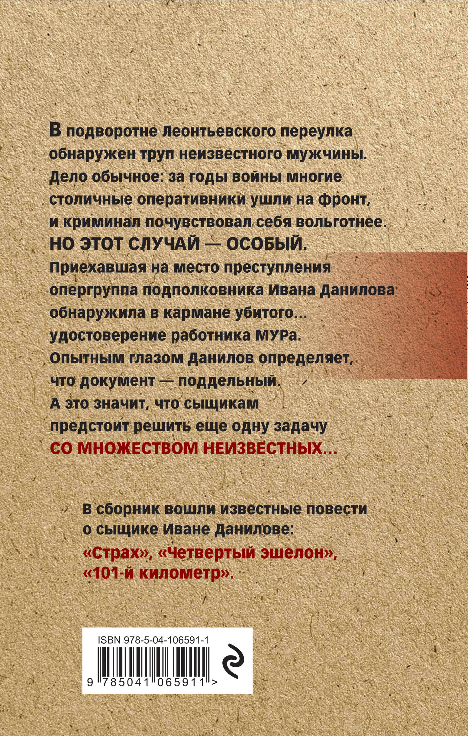Эдуард Хруцкий - известный мастер детективного жанра, создатель образа знаменитого сыщика Ивана Данилова. Книги автора выходят многотысячными тиражами и после его смерти, экранизации романов Э. Хруцкого вошли в «золотой фонд» нашего кино. В подворотне Леонтьевского переулка обнаружен труп неизвестного мужчины. Дело обычное: за годы войны многие столичные оперативники ушли на фронт, и криминал почувствовал себя вольготнее. Но этот случай - особый. Приехавшая на место преступления опергруппа подполковника Ивана Данилова обнаружила в кармане убитого… удостоверение работника МУРа. Опытным глазом Данилов определяет, что документ - поддельный. А это значит, что сыщикам предстоит решить еще одну задачу со множеством неизвестных… В сборник вошли известные повести о сыщике Иване Данилове: «Страх», «Четвертый эшелон», «101-й километр».| Издательство | ООО "Издательство "Эксмо" |