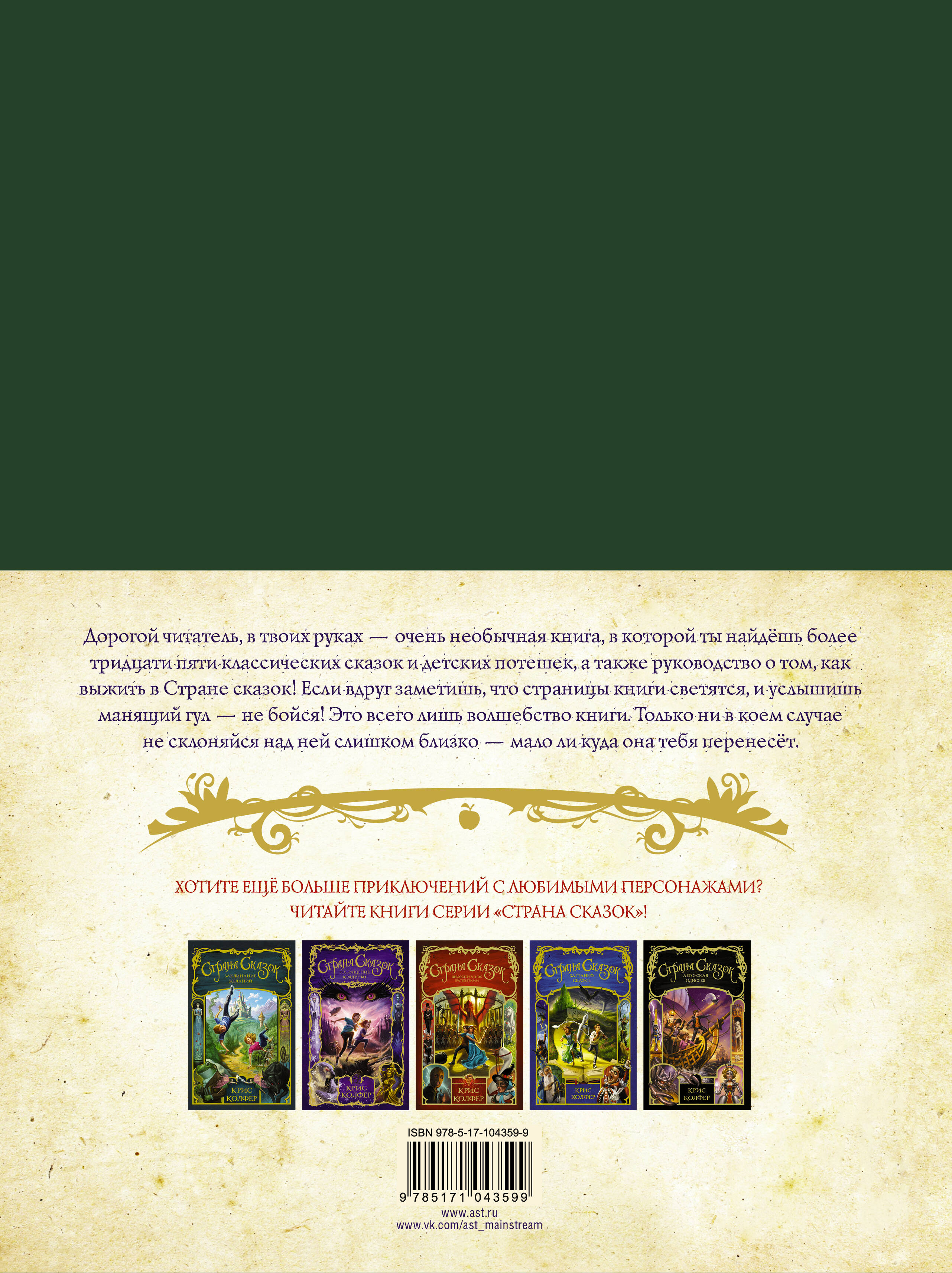 Погрузитесь в мир сказок с помощью этого подарочного издания, в котором содержится более тридцати пяти всеми любимых историй в пересказе автора бестселлеров по версии The New York Times Криса Колфера. Эта красочная книга придётся по вкусу и новым, и давним поклонникам, которых порадуют любимые сказки, такие как "Золушка", "Спящая красавица", "Джек и бобовый стебель" и другие. Именно в этот сборник сказок и угодили Алекс и Коннер Бейли в "Заклинании желаний". Перед вами красиво иллюстрированное дополнение к основной книжной серии - волшебная книга, с которой всё началось!| Издательство | ИЗДАТЕЛЬСТВО "АСТ" |