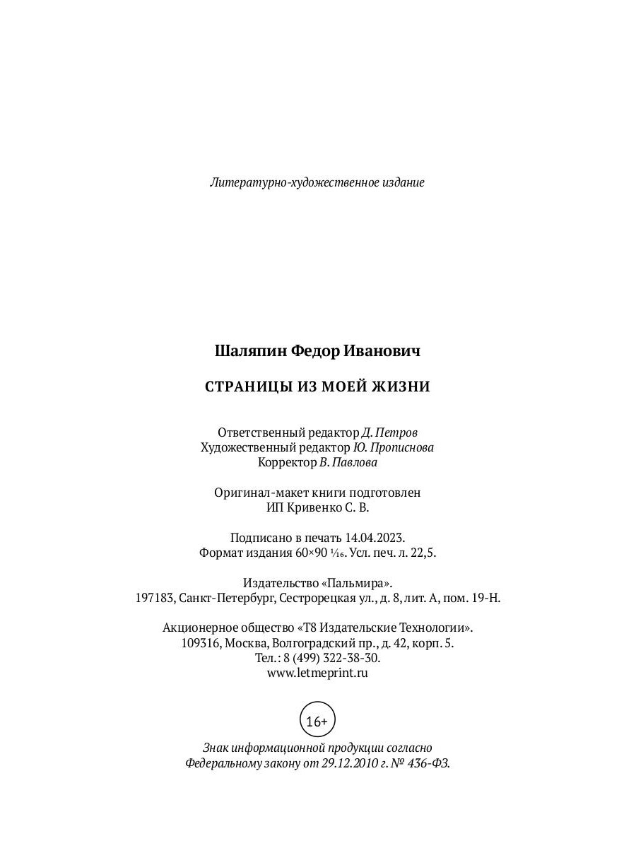 Федор Иванович Шаляпин (1873-1938) - оперный и камерный певец, солист Мариинского и Большого театров. Один из самых известных оперный исполнителей в истории России. Шаляпин оказал большое влияние на мировое оперное искусство. В автобиографической книге "Страницы из моей жизни" Шаляпин просто и правдиво рассказывает о своем трудном детстве, прошедшем в бедности и среди пьянства, знакомстве с музыкой, поразившей его до глубины души, первых шагах на сцене, приходящем успехе, впечатлениях от заграничных поездок, встречах с выдающимися деятелями культуры и обретении всемирной славы. Попутно он делится размышлениями об оперном искусстве, вдохновении, исполнительском мастерстве и социальных переменах, которые пришлись на годы его жизни. Я написал эти, может быть, скучные страницы для того, чтоб люди, читая их в это трудное время угнетения духа и тяжких сомнений в силе своей, подумали над жизнью русского человека, который хотя и с великим трудом, но вылез, выплыл с грязного дна жизни на поверхность ее и оказал делу пропаганды русского искусства за границей услуги, которые нельзя отрицать. Ф. И. Шаляпин| Издательство | Т8 RUGRAM |