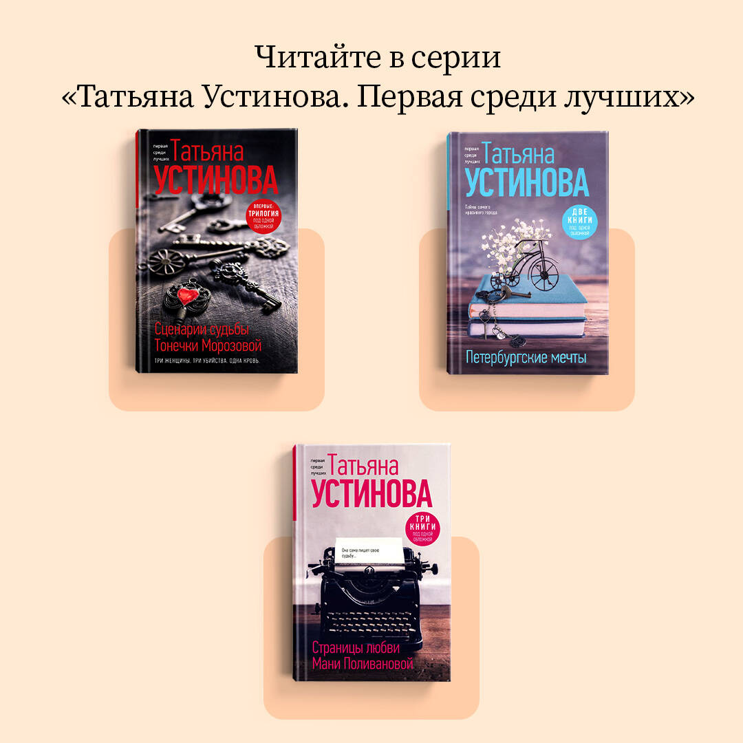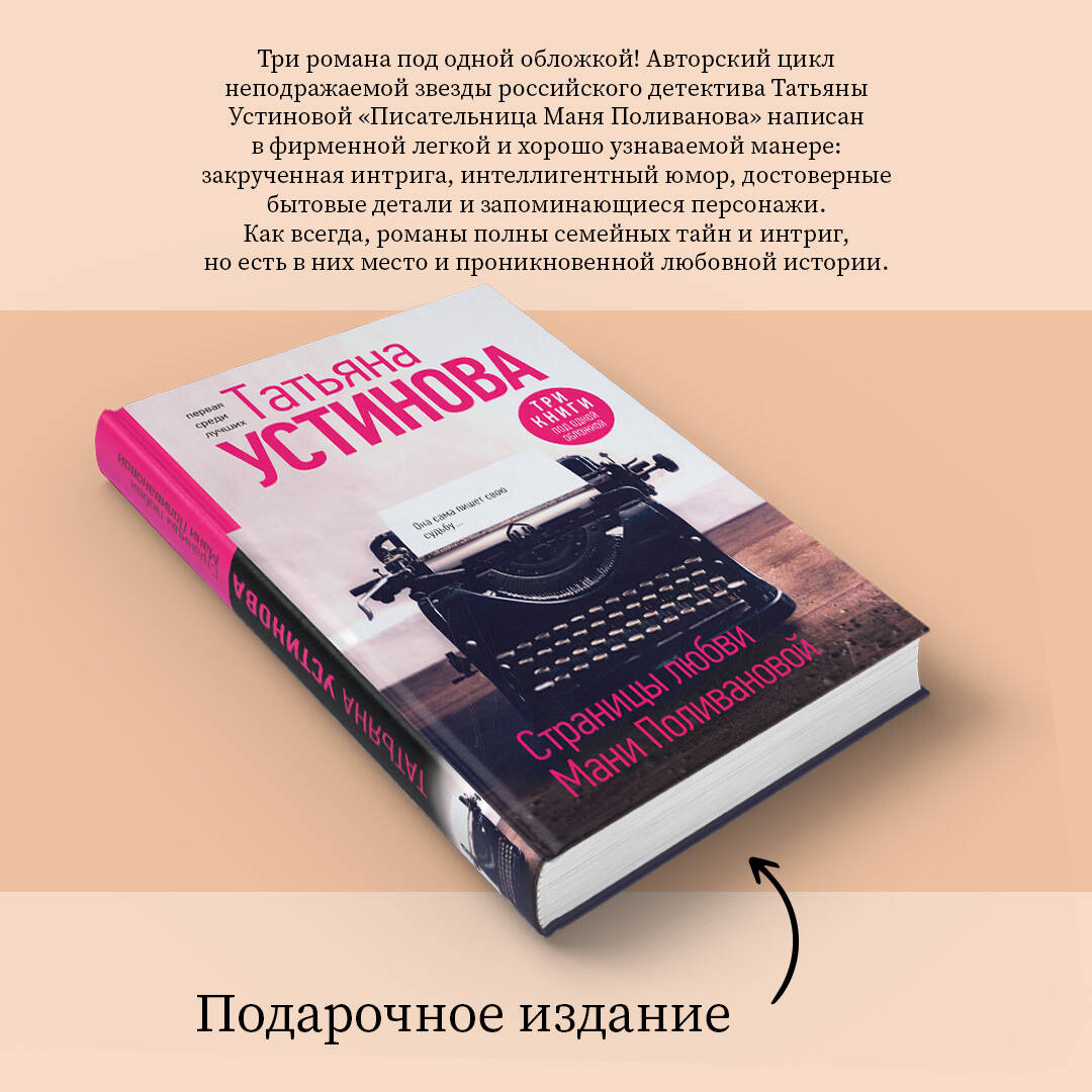 Три романа под одной обложкой! Авторский цикл неподражаемой звезды российского детектива Татьяны Устиновой «Писательница Маня Поливанова» написан в фирменной легкой и хорошо узнаваемой манере: закрученная интрига, интеллигентный юмор, достоверные бытовые детали и запоминающиеся персонажи. Как всегда, романы полны семейных тайн и интриг, но есть в них место и проникновенной любовной истории. Он ведет странную жизнь и, кажется, не слишком ею доволен. У него странная профессия, странные привычки, даже имя странное - Алекс Шан-Гирей!.. Издательство, в которое Алекса пригласили на работу, на первый взгляд кажется вполне мирным, уютным и процветающим. Все друг друга любят и заняты благородным делом - изданием книг. Все пойдет прахом как раз в тот день, когда в коридоре издательства обнаружится труп… Писатель Алекс Шан-Гирей решает, что должен снова вернуть себя и обрести свободу. И потому расстается с Маней Поливановой - женщиной всей своей жизни, а по совместительству автором популярных детективов. А Маня совершенно не выносит вранья и человеческих мучений. И если уж Алекс почему-то решил «освободиться» - пожалуйста! Ей нужно спасать Владимира Берегового - главу IT-отдела издательства «Алфавит», который попадает в почти мистическую историю с исчезнувшим трупом… В подъезде дома, где живет автор детективных романов Маня Поливанова, убит ее старый друг, накануне заходивший на «рюмку чаю» и разговоры о вечном. Деньги и ценности остались при нем, а он сам не был ни криминальным авторитетом, ни большим политиком, ни богачом! Так за что его убили? Алекс Шан-Гирей, возлюбленный Поливановой и по совместительству гений мировой литературы, может быть, и не похож на «настоящего героя». Он рассеян и очень любит копаться в себе. Тем не менее, он точно знает: разбираться в очередном происшествии, в которое угодила его подруга, предстоит именно ему…