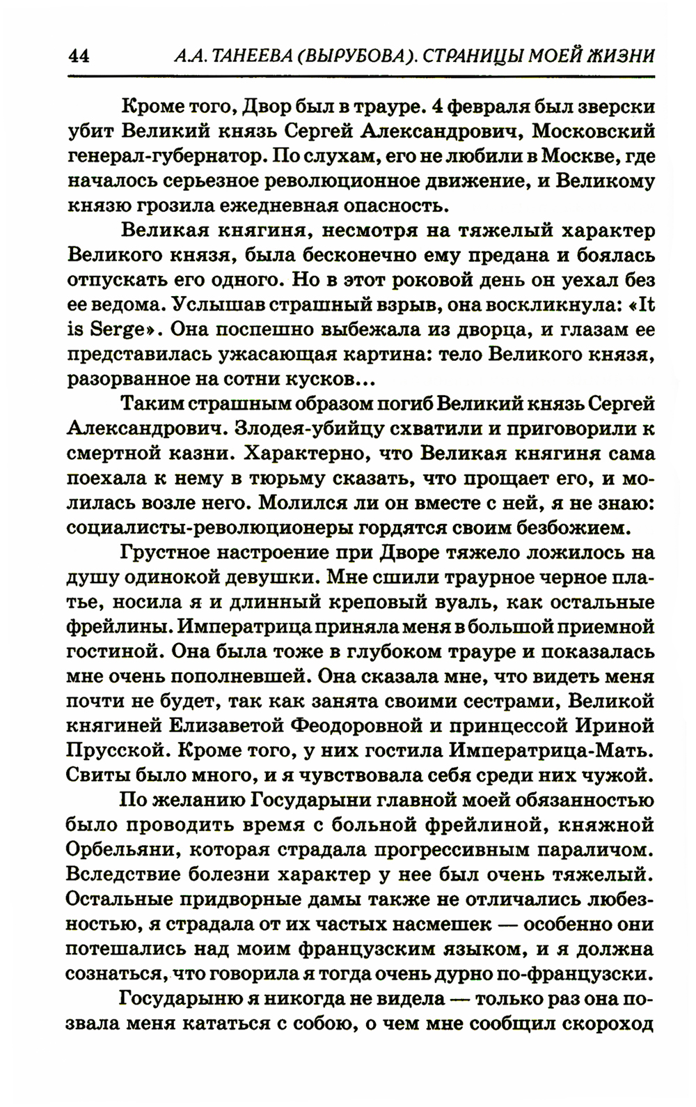 «Страницы моей жизни» - это бесценные свидетельства Анны Александровны Танеевой (Вырубовой) о жизни семьи последнего Российского Императора Николая Александровича Романова. Даже следователи Временного Правительства, стремившиеся найти подтверждение мифу о «темных силах», окружавших Русский Престол, не могли не признать, что показания Анны Александровны безупречно достоверны. Будучи подругой Государыни Императрицы Александры Феодоровны, А. А. Танеева хорошо знала всех членов Царской Семьи, была свидетельницей как нежной любви Августейших Супругов, так и их мужества в перенесении скорбей и их крепкого упования на Господа. Размышляя о причинах катастрофы, постигшей Россию в 1917 году, Анна Александровна пришла к выводу, что к началу XX века высшее общество практически полностью утратило понимание того, что значит Царь для России, сведя его роль лишь к политической составляющей. Высшее общество разъедали зависть, интриги и, как следствие, - заговор и предательство своего Государя. Наказание не заставило себя долго ждать - Россия погрузилась в кровавую смуту. Текст воспоминаний А.А. Танеевой (Вырубовой) воспроизведен по берлинскому изданию 1923 года. В предисловии и послесловии издатели знакомят читателей с судьбой самой Анны Александровны (монахини Марии), принявшей постриг спустя пять лет после мученической кончины Царской Семьи.| Издательство | Царское Дело |