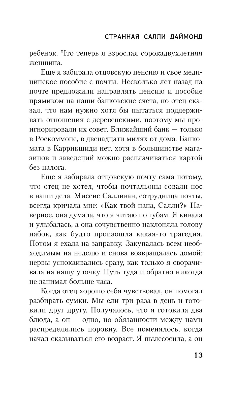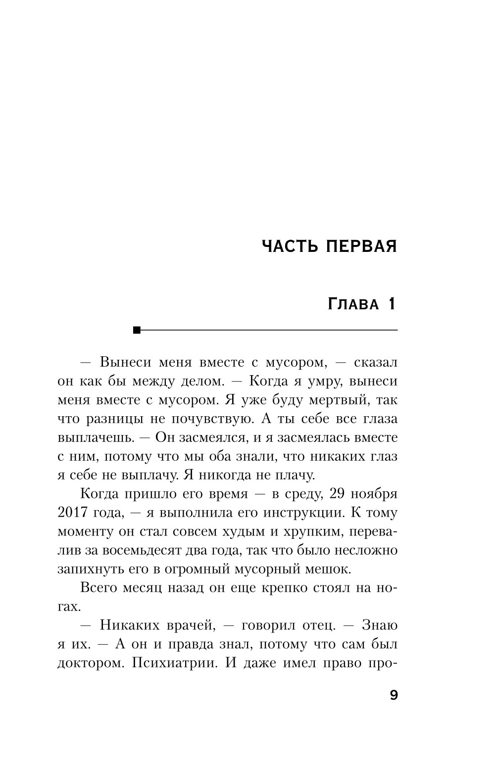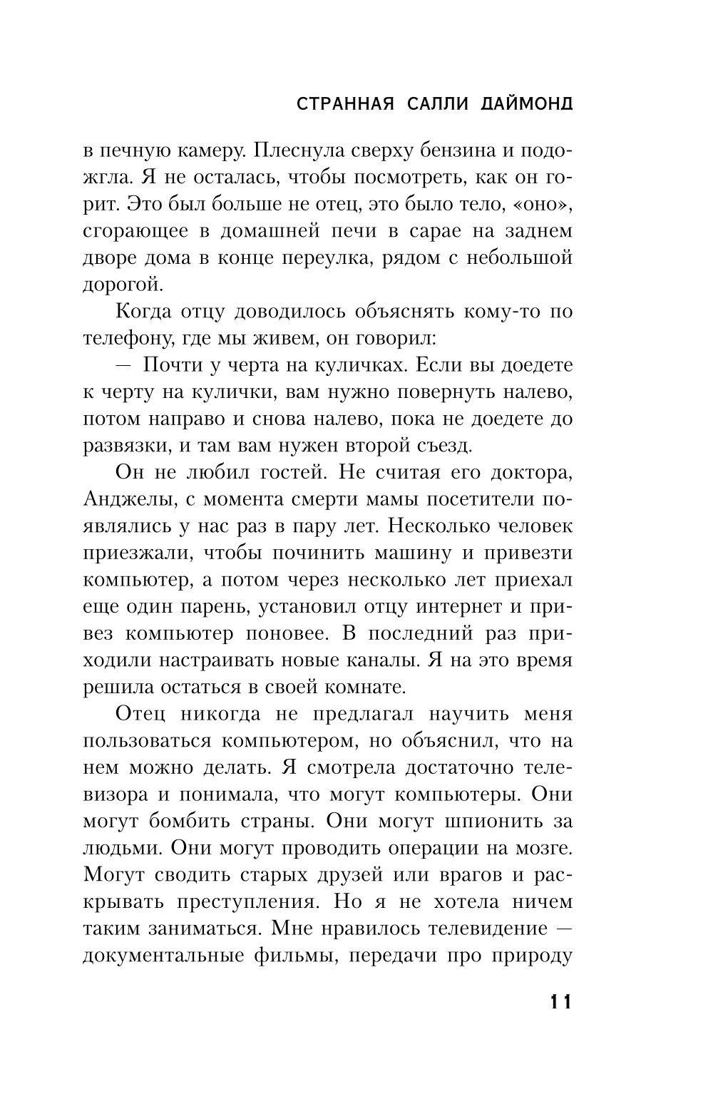 Мрачный, извращенный и одновременно трогательный триллер о женщине-социофобке, вынужденной противостоять непонятному ей миру и страшному прошлому, которое вернулось за ней. Бедная Салли Даймонд не может понять, почему то, что она сделала, кажется всем соседям и полиции таким странным. Она всего лишь выполнила просьбу своего отца - сожгла его мертвое тело в сарае вместе с мусором. Что не так? И почему полицейские недовольны тем, что потом Салли тщательно вымыла весь дом и выстирала одежду? Мама бы точно ею гордилась. После этой истории Салли оказывается в центре внимания голодных до сенсации СМИ и детективов. Внезапно она получает странный подарок - грязного игрушечного мишку с оторванным глазом и записку от некоего «С», которому явно известно что-то ужасное о ее прошлом. Но кто он? А еще Салли преследуют кошмары с изможденной женщиной в темной комнате, хотя до этого она никогда не видела снов. Притворяясь полжизни глухой, просто чтобы ни с кем не разговаривать, Салли приходится познавать этот мир с нуля. Ей предстоит выяснить, кто этот таинственный преследователь, чье присутствие с каждым днем ощущается все острее…| Издательство | Эксмо |