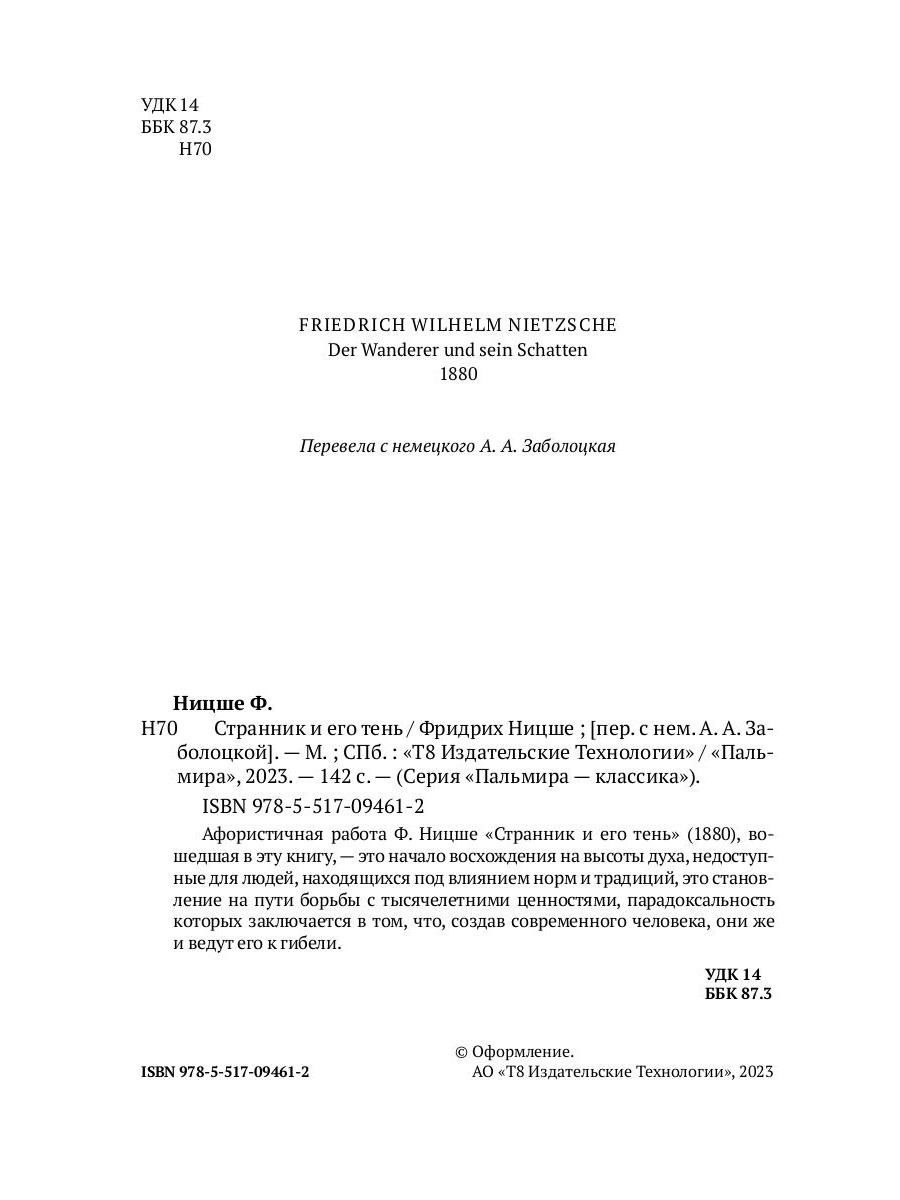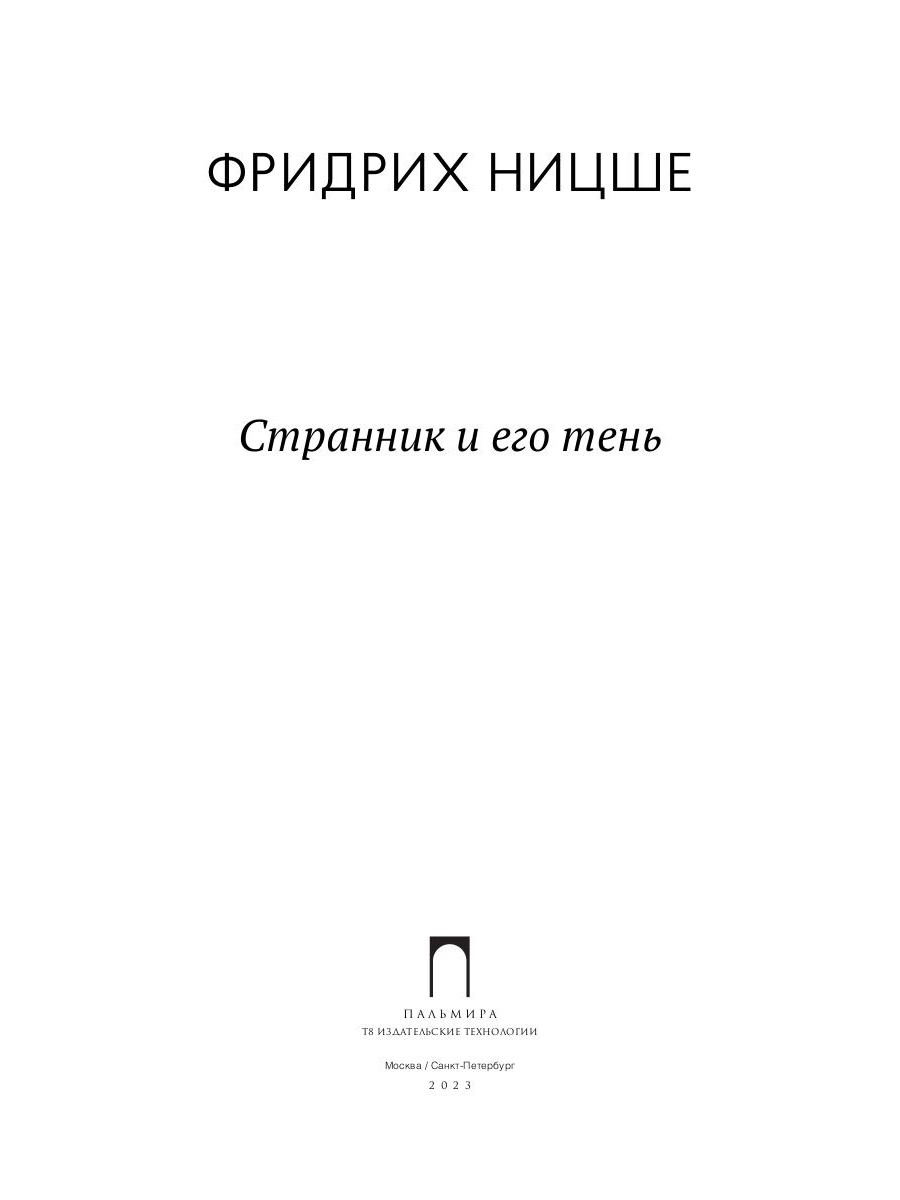 Фридрих Ницше (1844-1900) - немецкий философ, создатель философского течения, подвергшего критике ценности современной ему западной культуры, провозгласив их ложными и устаревшими. Афористичная работа Ф. Ницше "Странник и его тень" (1880), вошедшая в эту книгу, - это начало восхождения на высоты духа, недоступные для людей, находящихся под влиянием норм и традиций, это становление на пути борьбы с тысячелетними ценностями, парадоксальность которых заключается в том, что, создав современного человека, они же и ведут его к гибели.