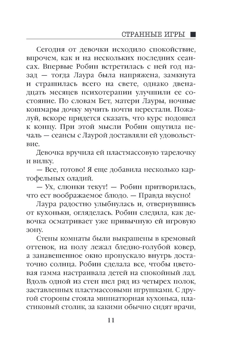 От автора мирового бестселлера «Внутри убийцы» о профайлере Зои Бентли, экранизированного в России. Восьмилетнюю Кэти Стоун похитили прямо с лужайки перед собственным домом. Прошло пятнадцать месяцев, и уже никто не верит, что девочка жива. Пока не случается чудо: Кэти находят на обочине дороги в соседнем городе. Теперь все хотят знать, что с ней произошло. НО ДЕВОЧКА НЕ ПРОИЗНОСИТ НИ СЛОВА И ОЧЕНЬ НАПУГАНА. Детский психолог Робин Харт - единственная, кому удалось наладить контакт с ребенком. В качестве игровой терапии она использует кукольный домик. И ТОГДА КЭТИ НАЧИНАЕТ ИГРАТЬ В КРАЙНЕ СТРАННЫЕ ИГРЫ. Каждый сеанс ее кукла-злодей делает жуткие вещи с одной из кукол, «живущих» в домике. Одну закалывает ножом, другую топит, третью приковывает цепью к пластиковому диванчику… А потом Робин узнает из новостей о телах девушек, найденных полицией. Телах с травмами, похожими на те, что наносила кукла-злодей. И становится ясно: ДЕВОЧКА РАЗЫГРЫВАЕТ НАСТОЯЩИЕ УБИЙСТВА…| Издательство | Эксмо |