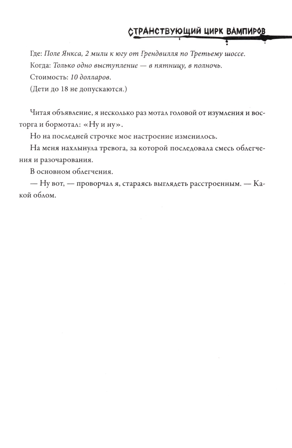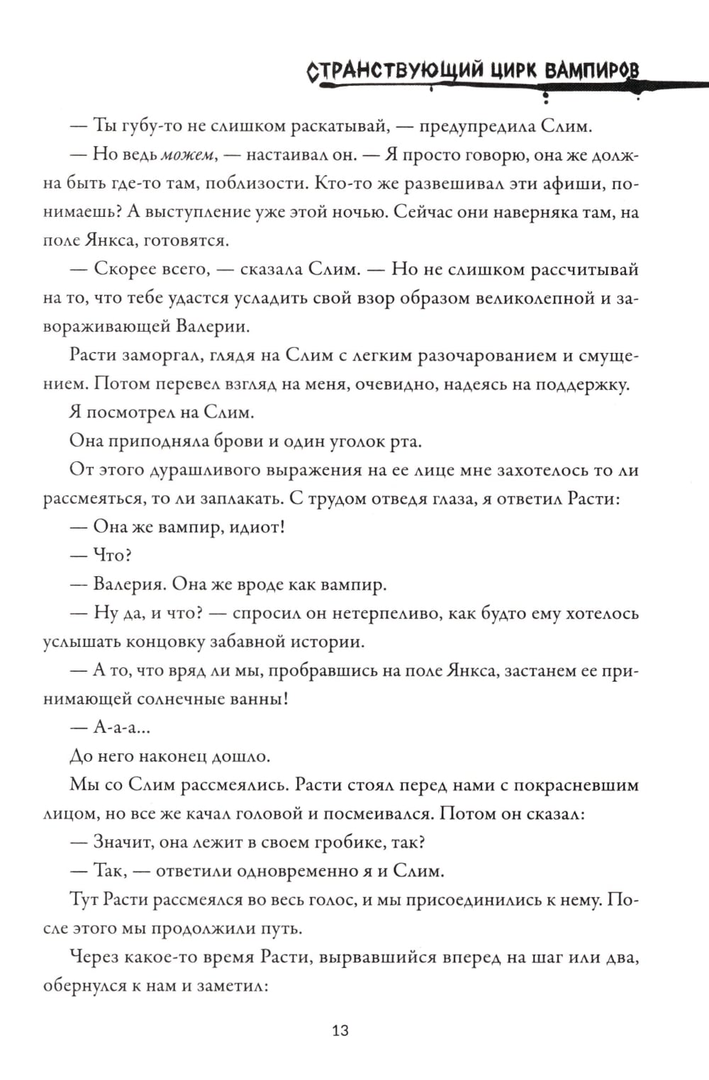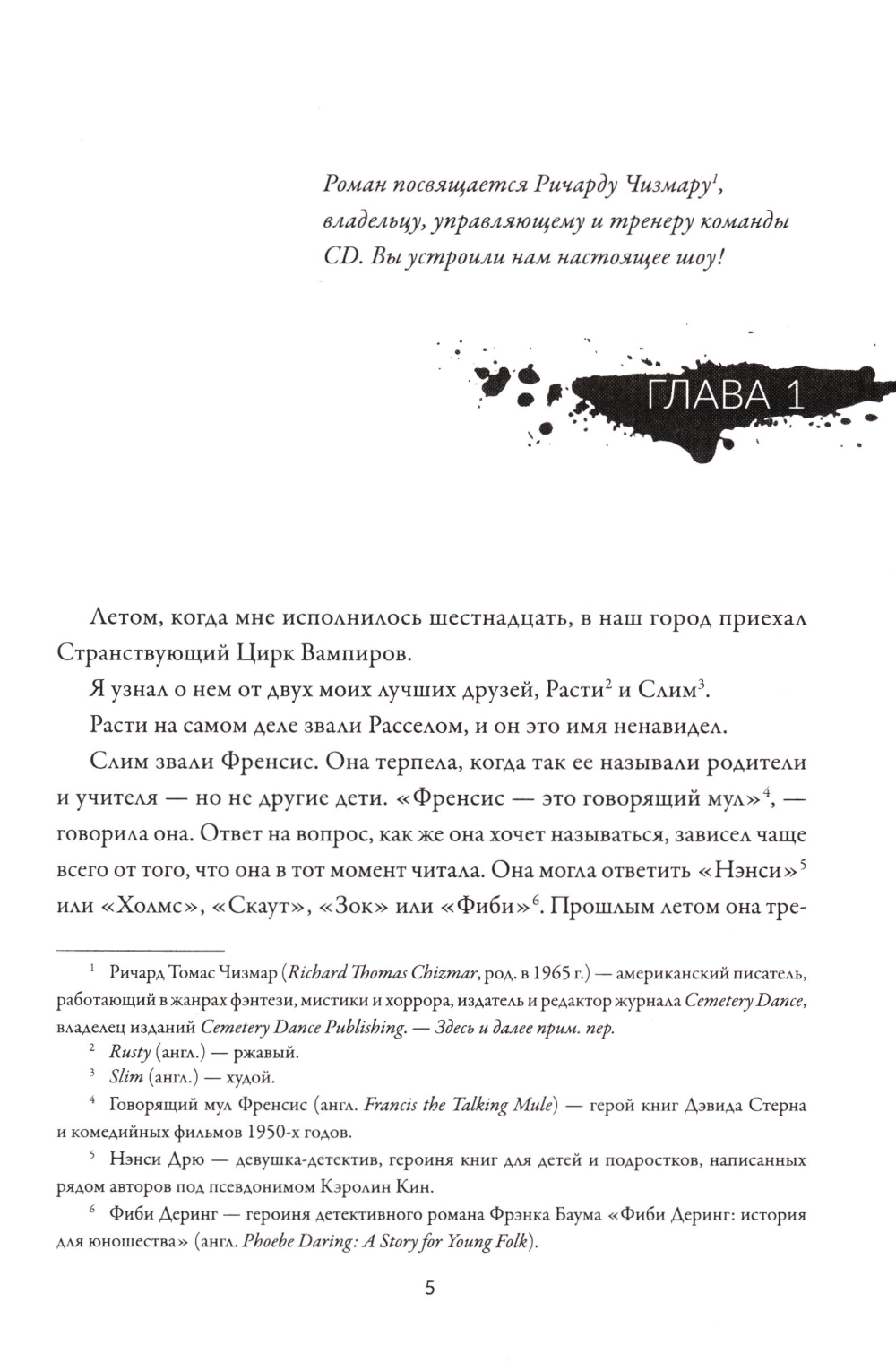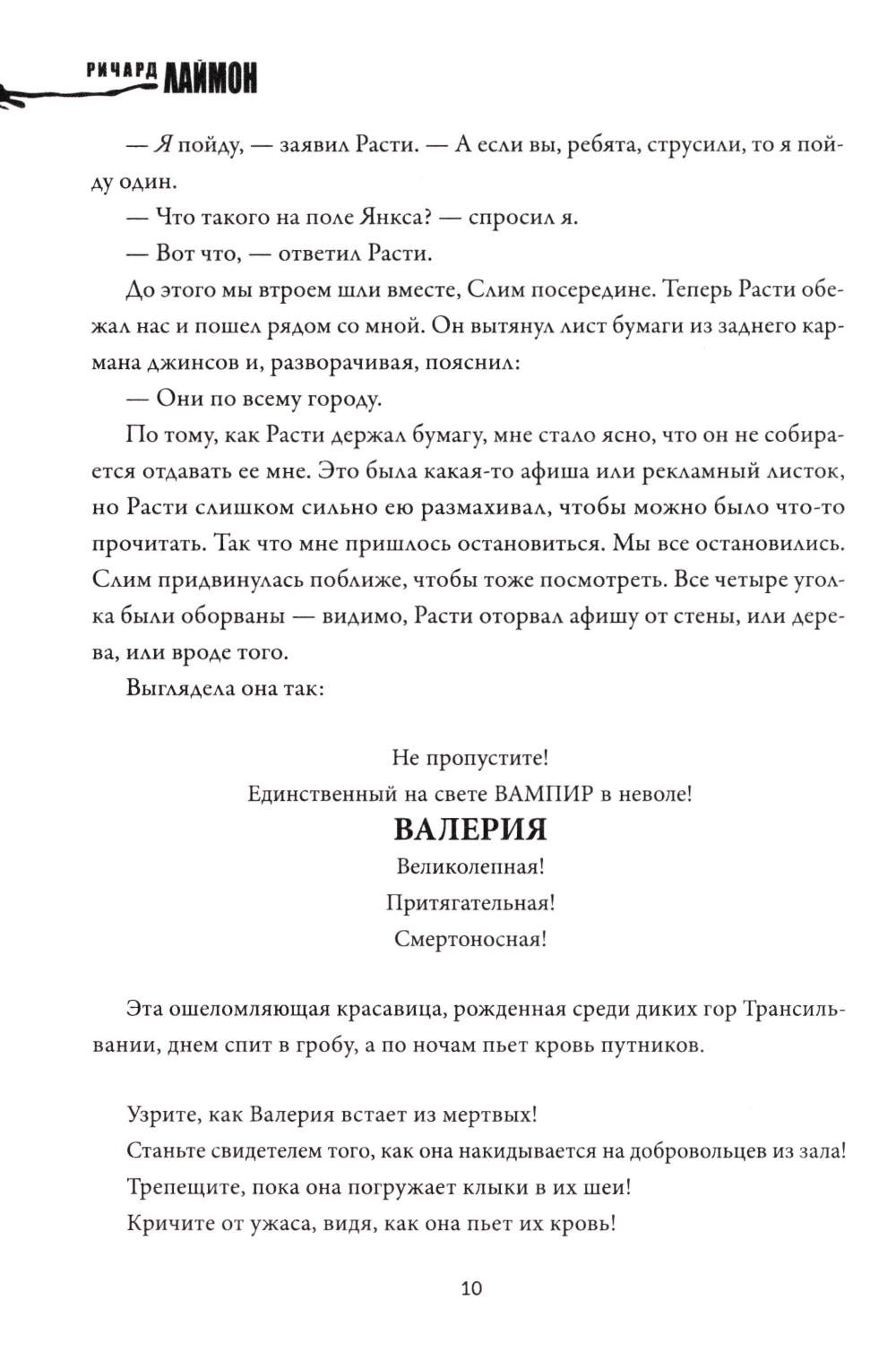 Лето 1963-го. В маленький провинциальный городок Грендвилль прибывает загадочный Странствующий Цирк Вампиров, а с ним совершенно неотразимая и смертельно опасная Валерия, последняя из древнего вампирского рода. Трое подростков готовы отдать все, чтобы попасть на это необычное шоу. И пусть на афише красуется надпись «Только для совершеннолетних», это лишь разжигает азарт в наших героях. Они еще не знают, что попасть на шоу непросто, но после его окончания вернуться домой куда сложнее.| Издательство | Феникс |