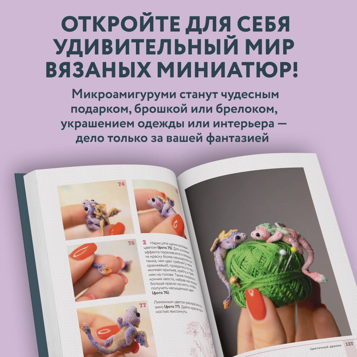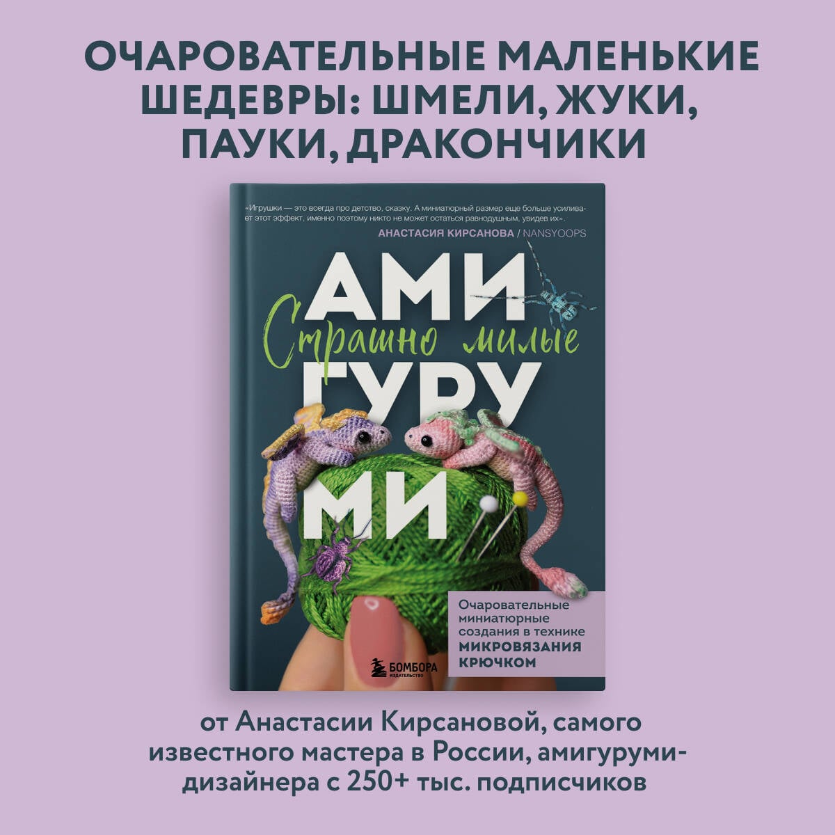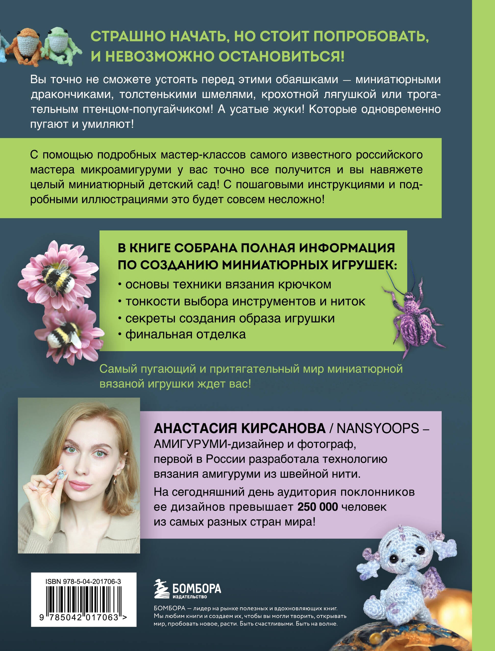 Драконы и пауки, шмели, жуки и лягушки. Очаровательные создания, которые одновременно и пугают, и притягивают нас. Как и удивительная техника микровязания крючком - сначала страшно, но стоит попробовать, и невозможно остановиться! С помощью подробных мастер-классов самого известного российского мастера микроамигуруми у вас точно все получится, и вы навяжете целый миниатюрный детский сад. В книге собрана полная информация по созданию миниатюрных игрушек: • основы техники вязания крючком; • тонкости выбора инструментов и ниток; • секреты создания образа игрушки; • финальная отделка. Каждая игрушка-амигуруми может стать брошкой или украшением рюкзака или сумки, ну и, конечно, шикарным подарком для близких и родных! Об авторе: Анастасия Кирсанова \ Nansyoops - АМИГУРУМИ-дизайнер и фотограф. Ее путь в мир вязаной игрушки начался в 2015 году, она первой в России разработала технологию вязания амигуруми из швейной нити. На сегодняшний день аудитория поклонников ее дизайнов превышает 250 000 человек из самых разных стран мира!| Издательство | ООО "Издательство "Эксмо" |