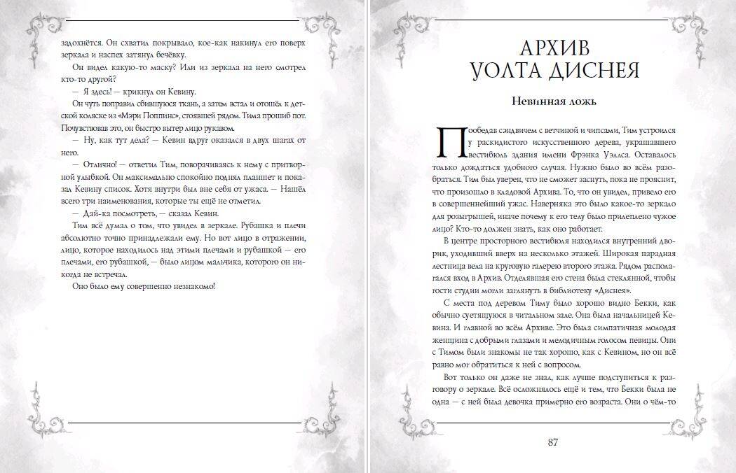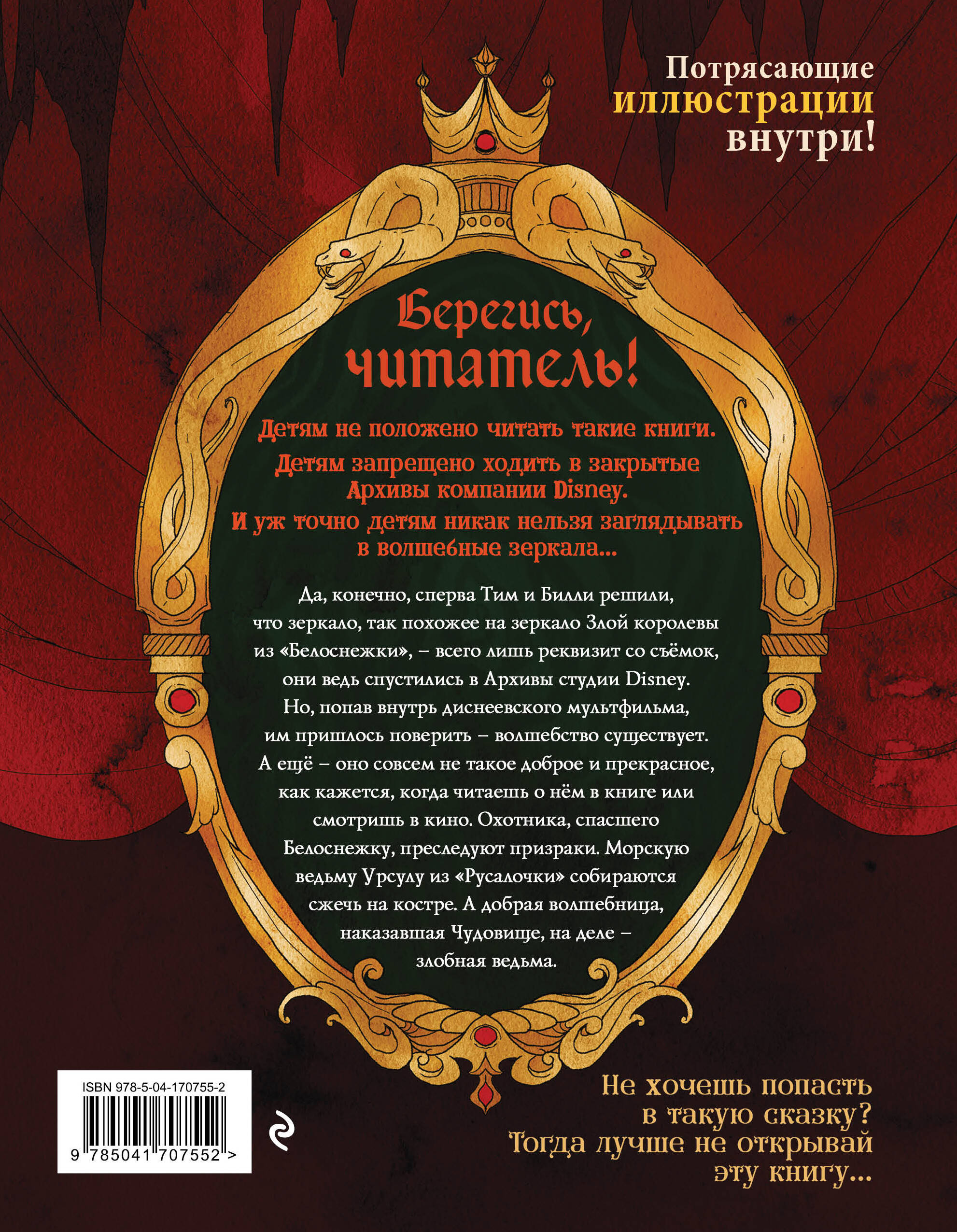 Берегись, читатель! Детям не положено читать такие книги. Детям запрещено ходить в закрытые Архивы компании Disney. И уж точно детям никак нельзя заглядывать в волшебные зеркала… Тиму и Билли - двум детям сотрудников студии Disney - приходится на самом деле поверить в волшебство, потому что они удивительным образом попадают прямиком в мультфильмы Disney, которые знают с детства! Вот только сказки эти совсем не добрые и таят в себе опасности, а порой и настоящий ужас! Не хочешь попасть в такую сказку? Тогда лучше не открывай эту книгу… ПОТРЯСАЮЩАЯ НОВИНКА ОТ DISNEY! Старые сказки в новом - более страшном - прочтении! В истории «Белоснежки» - зомби, в «Красавице и Чудовище» - злая ведьма, в «Русалочке» - инквизиция! Герои путешествуют по старым мультфильмам и зданию самой студии Disney! И всё это - в сопровождении ПОТРЯСАЮЩЕ КРАСИВЫХ ДВУХЦВЕТНЫХ ИЛЛЮСТРАЦИЙ! Книга понравится читателям от 10 лет.| Издательство | ООО "Издательство "Эксмо" |