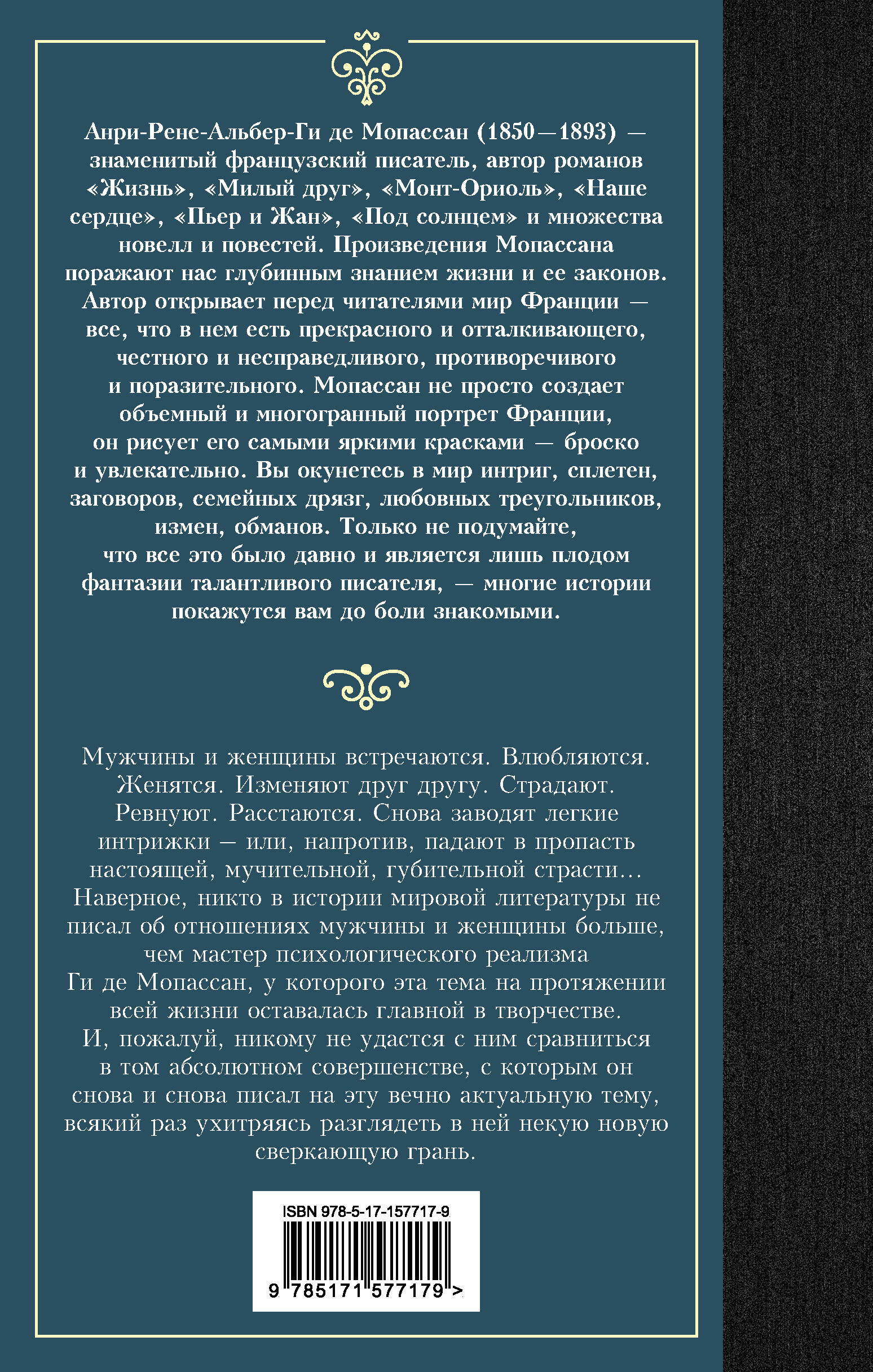 Мужчины и женщины встречаются. Влюбляются. Женятся. Изменяют друг другу. Страдают. Ревнуют. Расстаются. Снова заводят легкие интрижки - или, напротив, падают в пропасть настоящей, мучительной, губительной страсти... Наверное, никто в истории мировой литературы не писал об отношениях мужчины и женщины больше, чем мастер психологического реализма Ги де Мопассан, у которого эта тема на протяжении всей жизни оставалась главной в творчестве. И, пожалуй, никому не удастся с ним сравниться в том абсолютном совершенстве, с которым он снова и снова писал на эту вечно актуальную тему, всякий раз ухитряясь разглядеть в ней некую новую сверкающую грань.| Издательство | ИЗДАТЕЛЬСТВО "АСТ" |