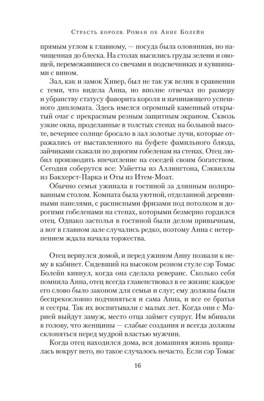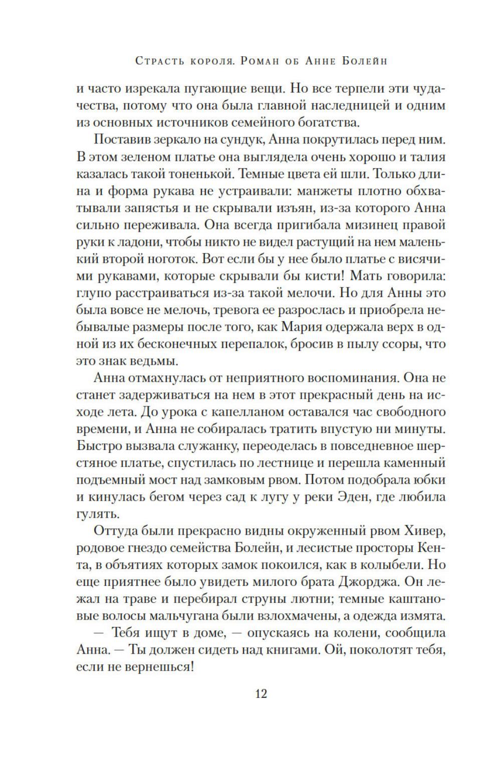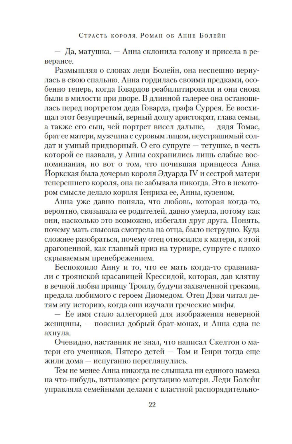 Юная Анна Болейн, получившая блестящее воспитание во Франции, была представлена английскому королю Генриху VIII и сразила его наповал. Смелая, умная, разносторонне одаренная, она убеждена, что женщины рождаются не только для того, чтобы подчиняться мужчинам. Презирая любовные интриги, Анна отказывает королю, разжигая его страсть. Но разве она не достойна короны более, чем кто-либо другой, ведь в ее жилах течет кровь Плантагенетов? Она не любит жестокого Генриха, но королевская власть для нее важнее любви. Ей не жаль заплатить за корону любую цену. Главное, действовать хладнокровно, не теряя головы... Силой своего писательского таланта популярный автор и известный историк Элисон Уэйр пытается восстановить справедливость по отношению к своей героине, одной из самых трагических фигур XVI столетия - королеве, которую ненавидели подданные; женщине, оболганной перед мужем. «Страсть короля. Роман об Анне Болейн» - это вторая книга из драматической серии, посвященной шести женам короля Генриха VIII.| Издательство | Азбука |