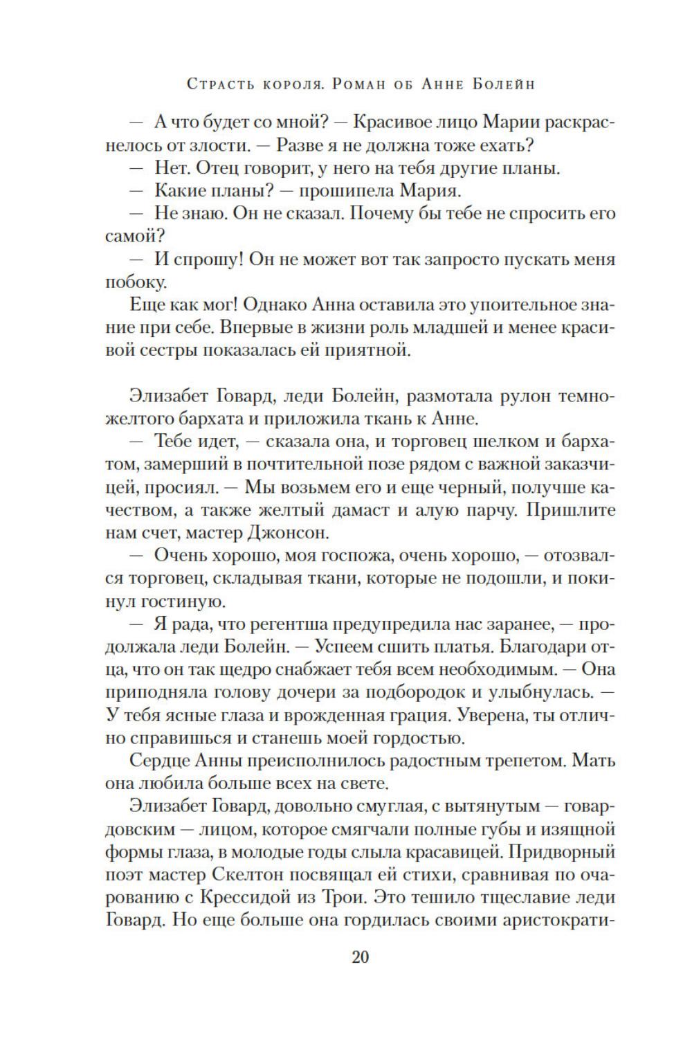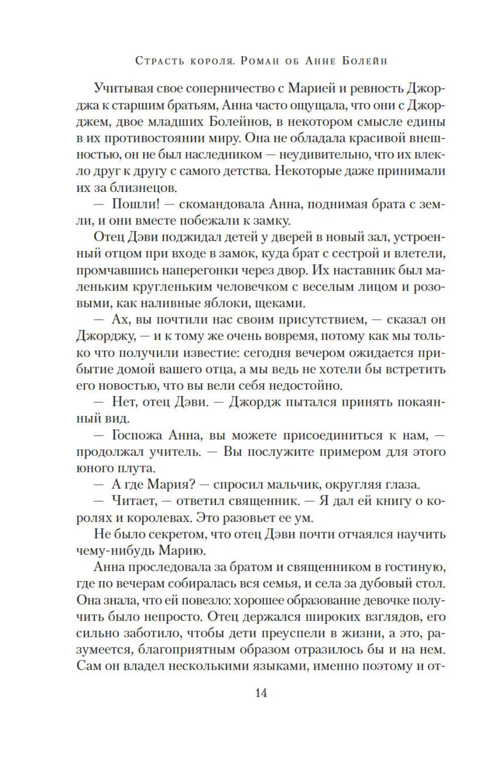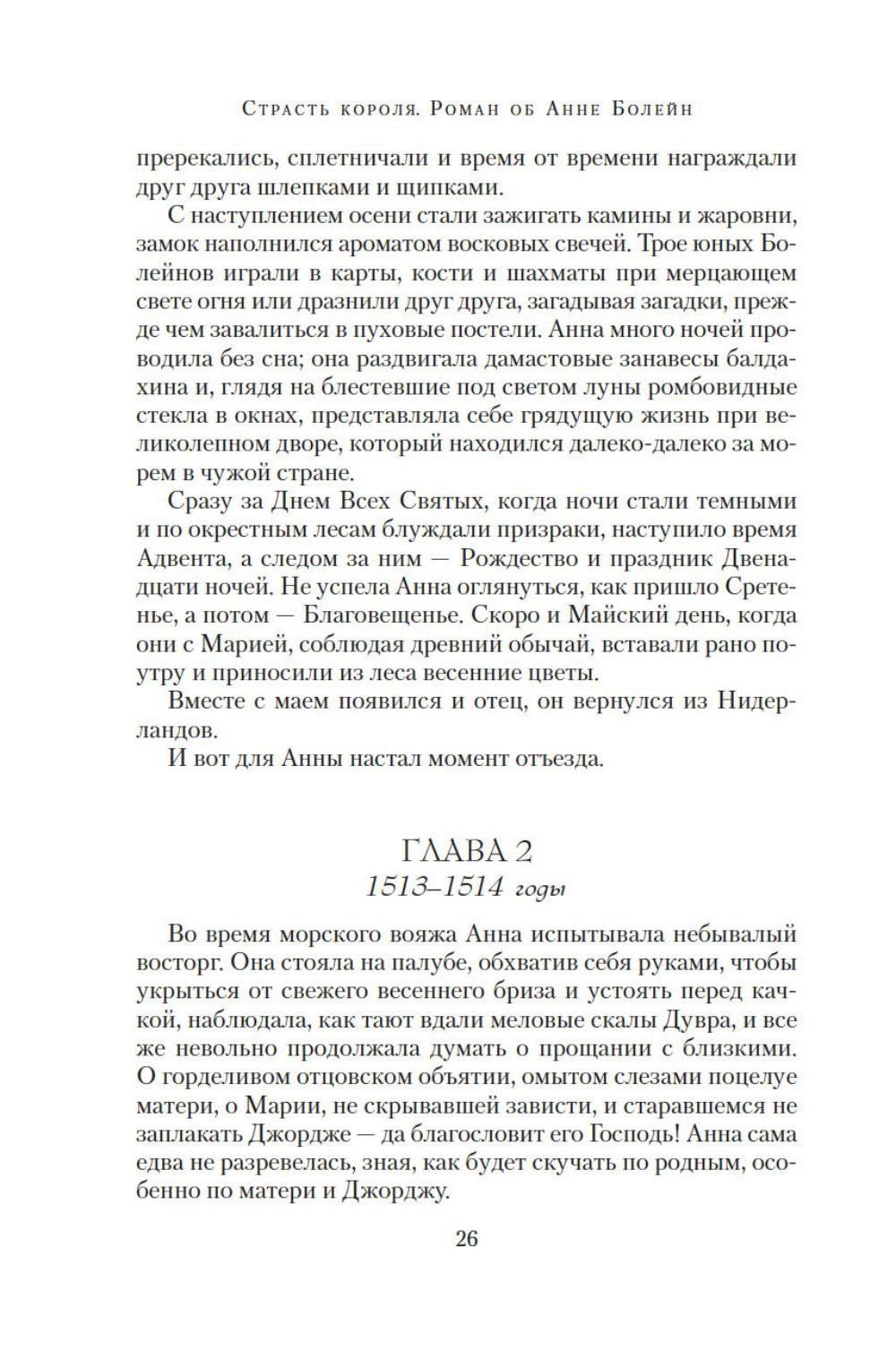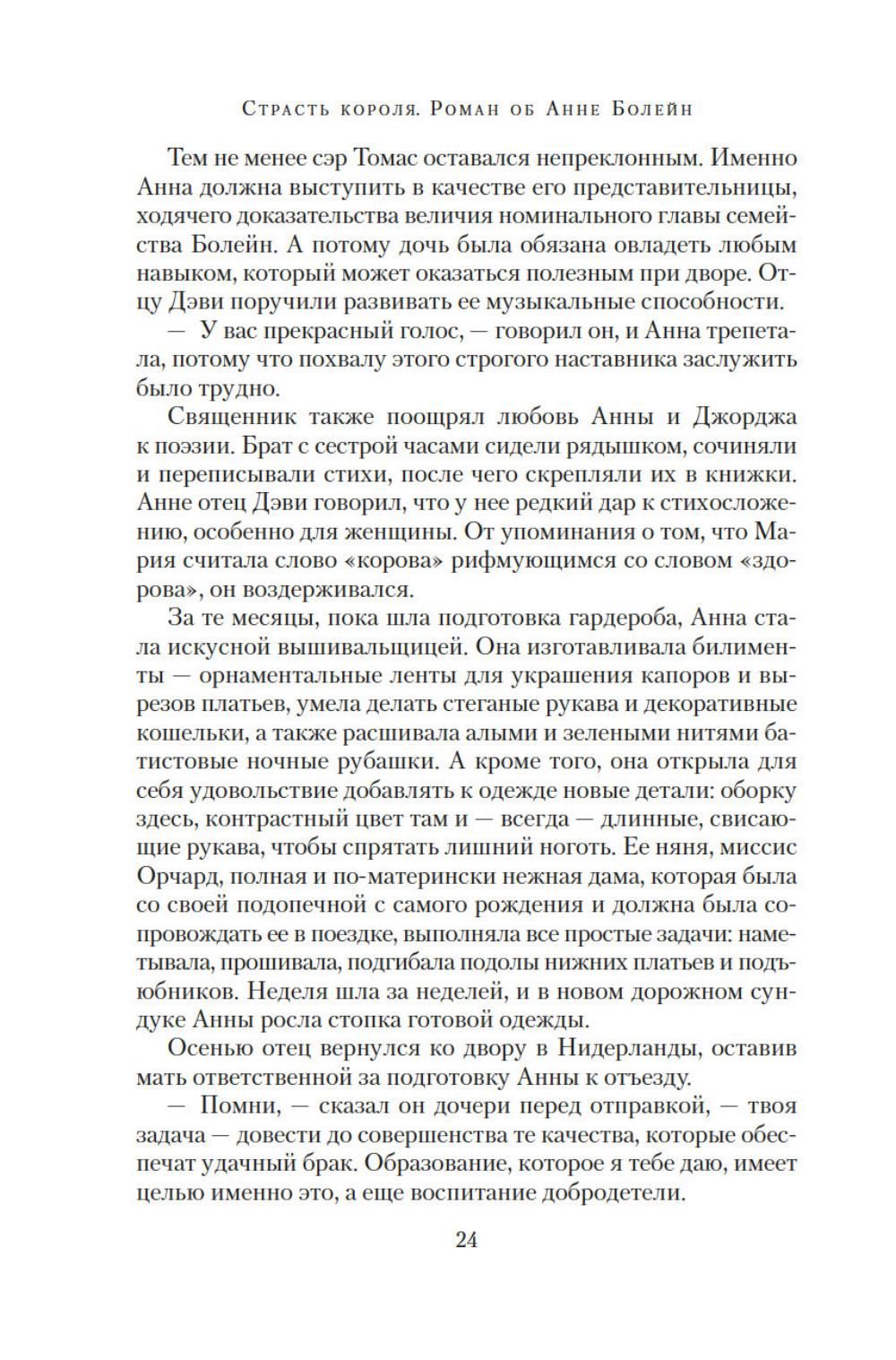 Юная Анна Болейн, получившая блестящее воспитание во Франции, была представлена английскому королю Генриху VIII и сразила его наповал. Смелая, умная, разносторонне одаренная, она убеждена, что женщины рождаются не только для того, чтобы подчиняться мужчинам. Презирая любовные интриги, Анна отказывает королю, разжигая его страсть. Но разве она не достойна короны более, чем кто-либо другой, ведь в ее жилах течет кровь Плантагенетов? Она не любит жестокого Генриха, но королевская власть для нее важнее любви. Ей не жаль заплатить за корону любую цену. Главное, действовать хладнокровно, не теряя головы... Силой своего писательского таланта популярный автор и известный историк Элисон Уэйр пытается восстановить справедливость по отношению к своей героине, одной из самых трагических фигур XVI столетия - королеве, которую ненавидели подданные; женщине, оболганной перед мужем. «Страсть короля. Роман об Анне Болейн» - это вторая книга из драматической серии, посвященной шести женам короля Генриха VIII.| Издательство | Азбука |